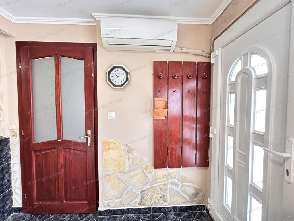 A házrész egy laminált parkettával burkolt szobából, egy egybenyitott nappali–konyha–étkező térből hidegburkolattal, valamint egy fürdőszoba+WC helyiségből áll. A víz-, villany- és gázvezetékek 2012-ben teljeskörűen cserélve lettek, az elektromos hálózat 32 amperes. Az ingatlan biztonságát működő kamerarendszer növeli, a tető jó állapotú.