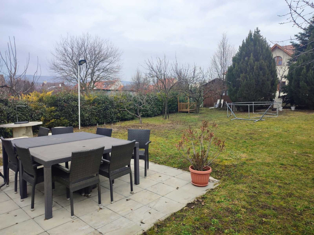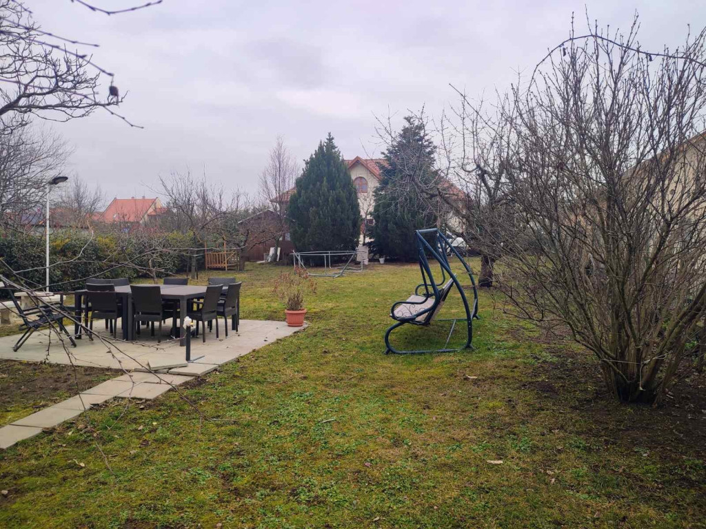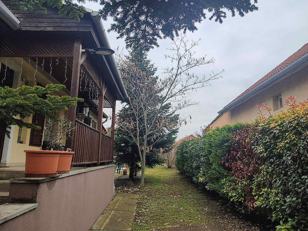 A telek szépen parkosított, örökzöldek övezik körbe a kerítés vonalán, így biztosítva a lakók intim szféráját. A kertben faház szolgál tárolóként, illetve van egy nagyméretű ciszterna a nyári locsoláshoz.