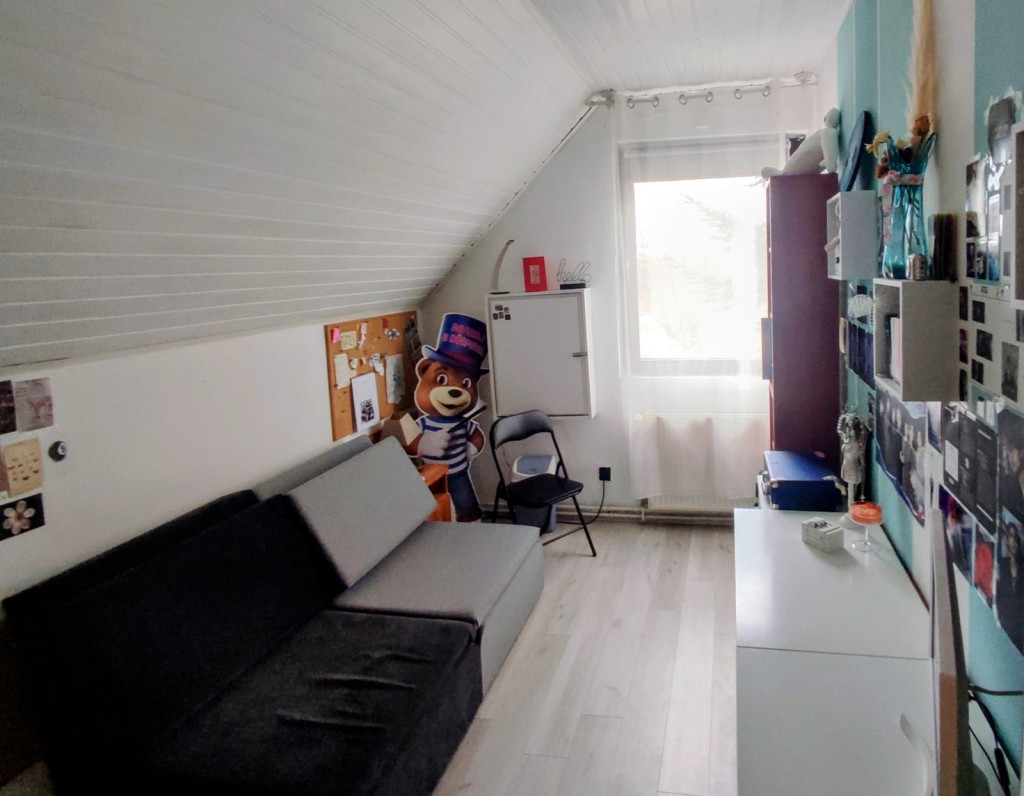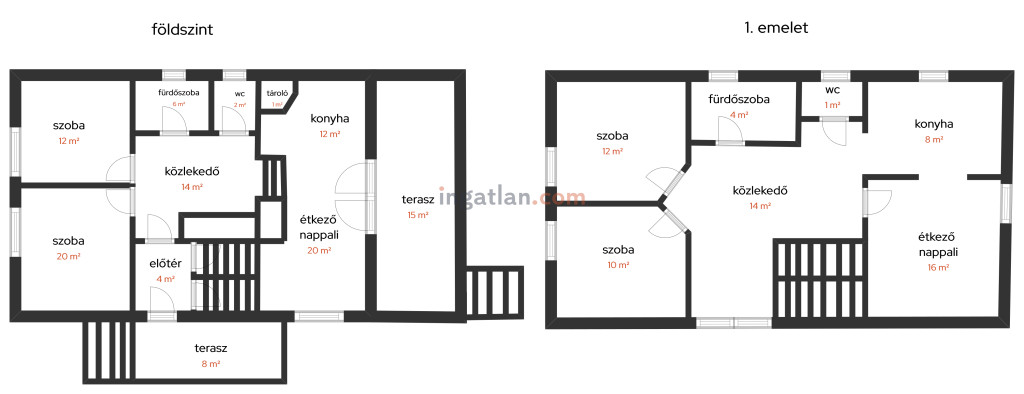 Az emeleten (65 nm) egy amerikai konyha-étkező-nappali, 2 szoba, fürdőszoba, toalett és közlekedő került kialakításra.