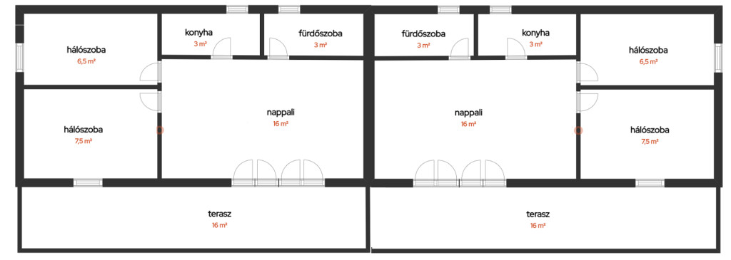 A lakások egyenként 36 nm-es lakóterülettel és 16 nm-es fedett terasszal rendelkeznek. A lakások elosztása: nappali, 2 hálószoba, konyha, fürdőszoba, terasz. Mindkét lakáshoz tartozik egy-egy pince jellegű tároló. A fűtés gázkonvektorral megoldott, a melegvizet gázbojler biztosítja. Minden nyílászáró rolóval és spalettával is ellátott. Az udvarban több autó beállására van lehetőség (viacolorral burkolt), mindkét utca felől megközelíthető a szépen parkosított kert.