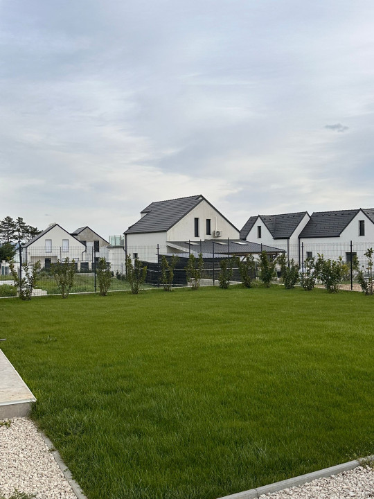 A térkövezett udvar elektromos kapun át közelíthető meg, két autó számára kínál kényelmes parkolást. A füvesített kertet automata öntözőrendszer tartja mindig üdén, a babérmeggyel körbeültetett határ pedig intimebbé teszi a környezetet.