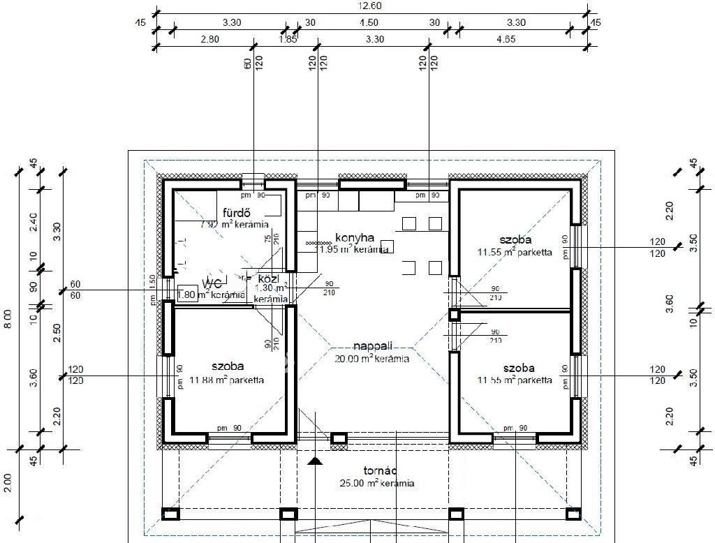 30 cm vastag Porotherm tégla falazat + 15 cm külső hőszigetelés.