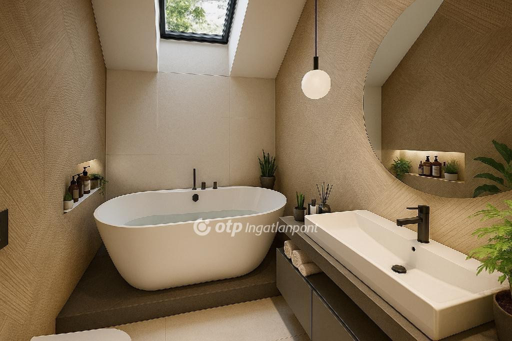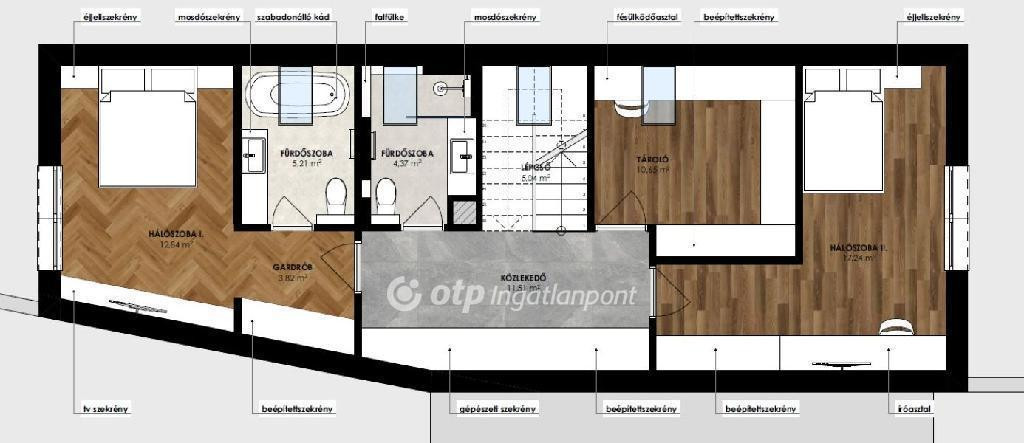 Emelet: Kettő tágas hálószoba biztosítja a kényelmes pihenést. Ezekhez a szobákhoz két fürdőszoba tartozik: az egyik káddal, a másik zuhanyzóval felszerelve a maximális kényelem érdekében, valamint egy gardrób rész, hogy a tárolás is megoldott legyen.