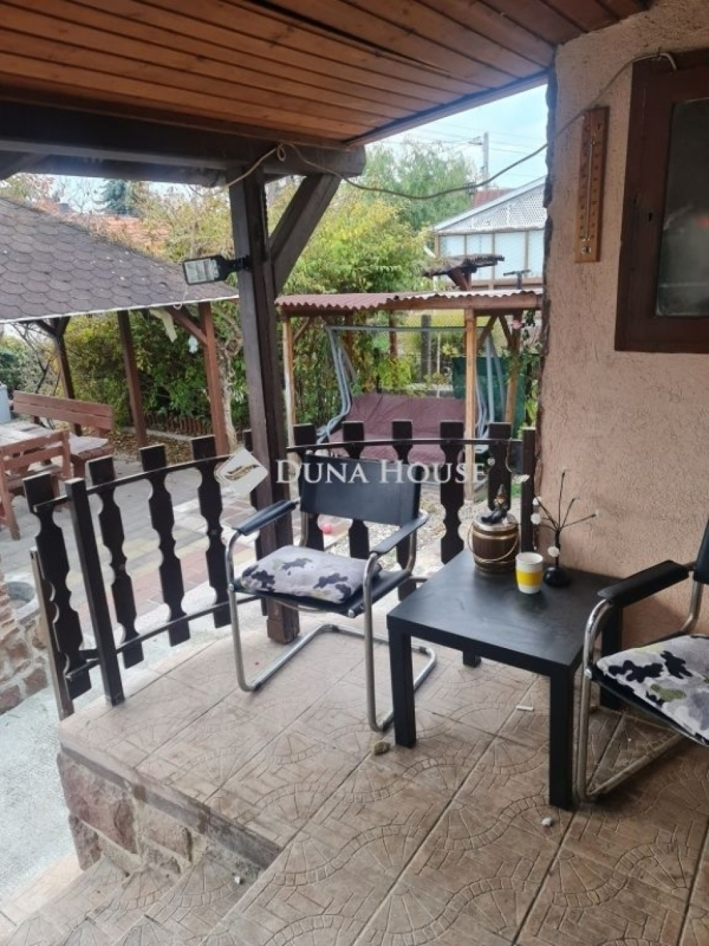 Külön belső kerítés osztja meg a telekrészt: zavartalan, fedett kerti kiülő az egyik oldalon, külön bejárat az üzlethelyiséghez a másikon