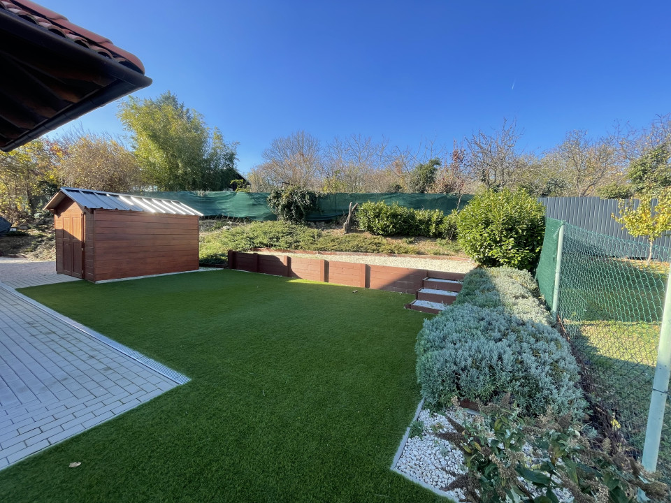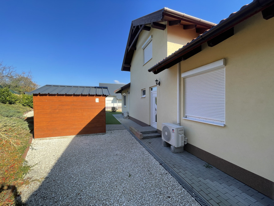 A gondozott kertben 9 m²-es faház szolgál tárolóként. 4 autó számára kialakított parkoló kényelmes megoldás a család minden tagjának. Közművek: víz, villany (földkábeles), csatorna – a gáz a telekhatáron belül elérhető.