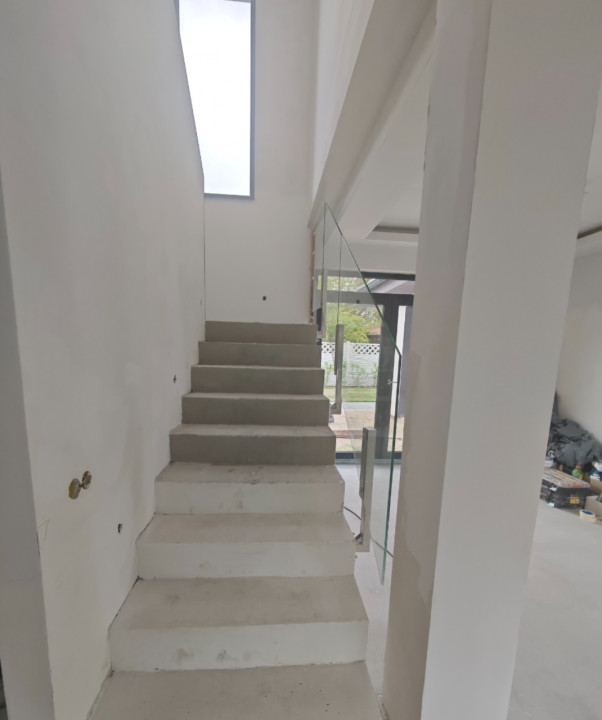Az alsó szintről az emeletre érve kétkarú üvegkorlátos lépcső vezet, amelyről egy világos nappaliba érünk,