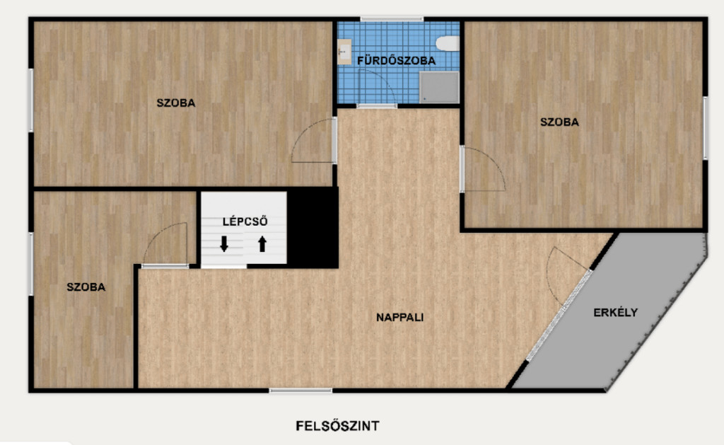 A földszinten egy hálószoba, amerikai konyhás nappali, sarokkádas fürdőszoba beépített szaunával, külön WC és kamra kapott helyet, az emeleten három hálószoba, egy emeleti nappali és egy zuhanykabinos fürdőszoba található.
