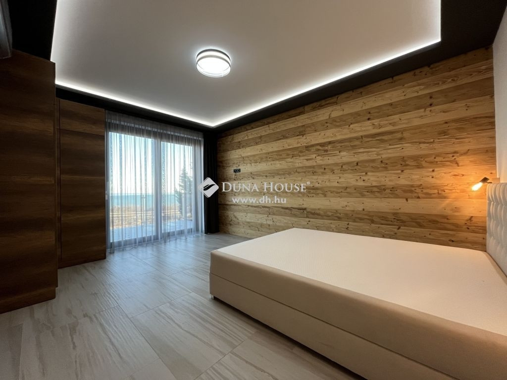 A felső szinten garázs, amerikai konyhás nappali, hálószoba, hálószoba fürdőszoba kapcsolattal, vendég mosdó, valamint egy 25 négyzetméteres panoráma terasz található.
