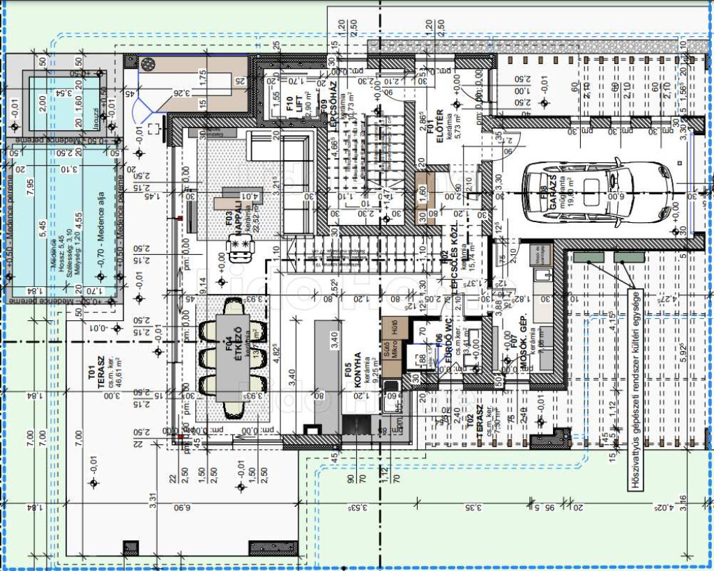 A földszinten L alakban elterülő 47 nm-es terasz lehetőséget biztosít szauna, jakuzzi vagy medence kialakítására, melyek opcionálisan kérhetők.