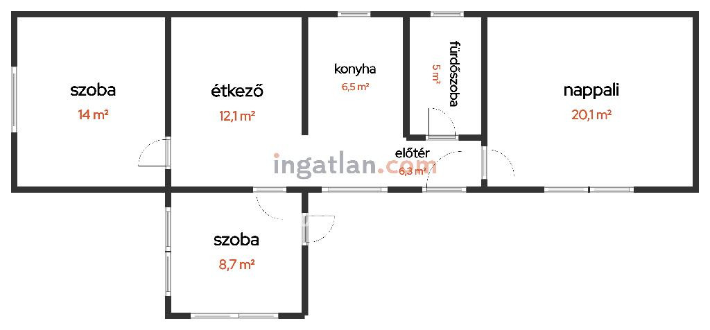 A telek területe 1 400 nm, az ingatlan hasznos alapterülete 72,7 nm. Az elrendezés praktikus: két szoba, nappali, konyha, étkező és fürdőszoba található benne.