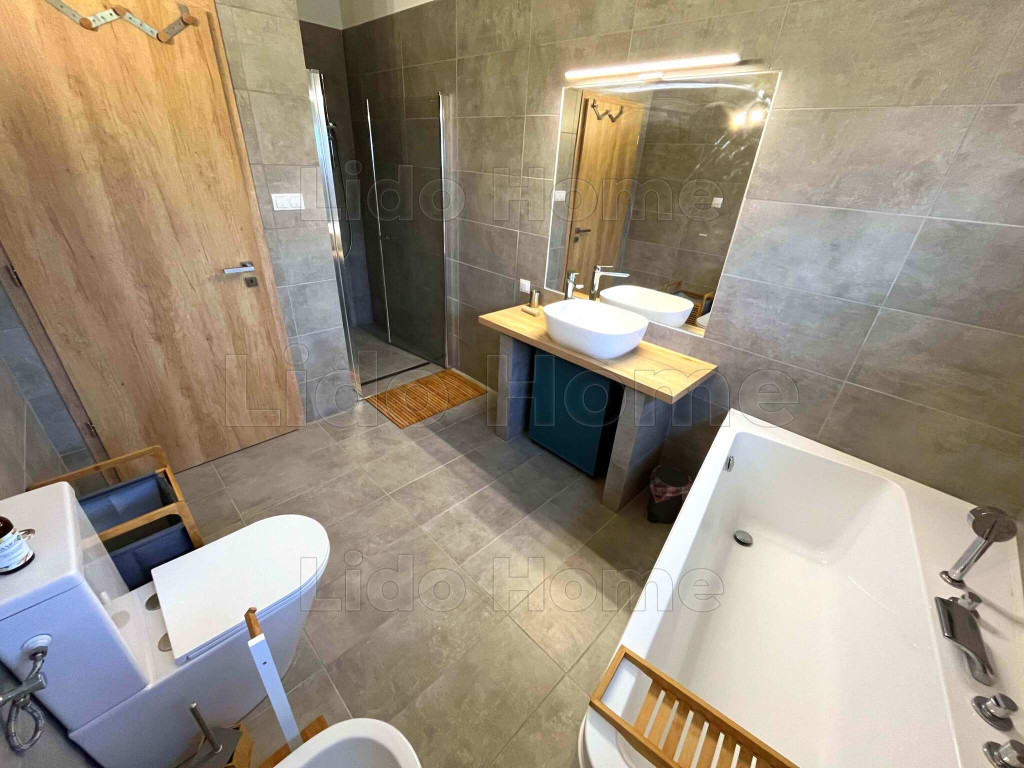 -Modern kialakítás: Letisztult,tágas belső terek, magas minőségű burkolatok és szaniterek, prémium anyaghasználat.