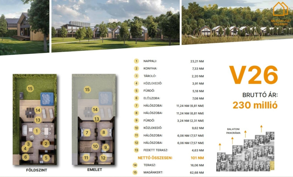 min. 62 m² magánkert.