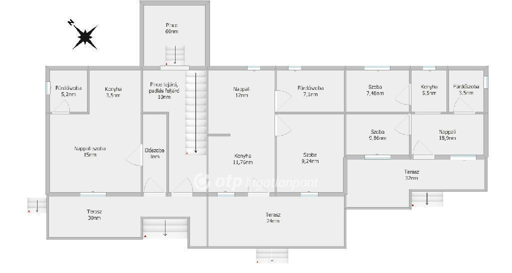 A lakrészek mindegyikében megtalálható konyha, fürdőszoba, nappali, hálószoba. Mindhárom lakrészhez saját, nagy terasz és saját, sövénnyel leválasztott, kocsibeállós kertrész tartozik. A pincerész külön bejáraton közelíthető meg, ahol a padlásfeljáró is megtalálható.