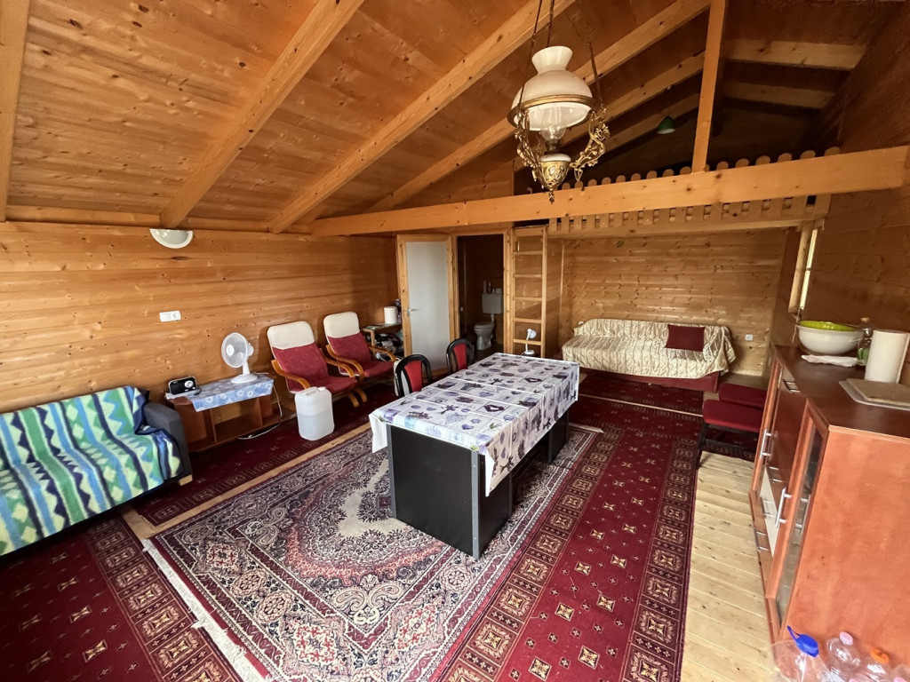 Balatonhenyén, domboldal közepén lévő, jól megközelíthető, külterületi, panorámás telek , nyaraló épülettel eladó. Az épület alsó szintje hagyományos falazott szerkezetű. Ez a szint egy légteres helyég 24 m2-es, a helység eleje kertkapcsolatos a helyiség hátsó része már a földbe van süllyesztve. Tárolónak, de akár lakószobaként is használható. A felső szinten fa szerkezetű ház áll, ennek a lakóterülete 24 m2 , amely előtt egy 20 m2 fedett terasz lett kialakítva. Az épület áram ellátása önálló villanyórával megoldott. Vezetékes víz nincs, a fürdőszoba vízhasználatot jelenleg utántölthetős külső, 1 m3-es, ibc víztartály biztosítja. Kútfúrásnak nincs akadálya.
