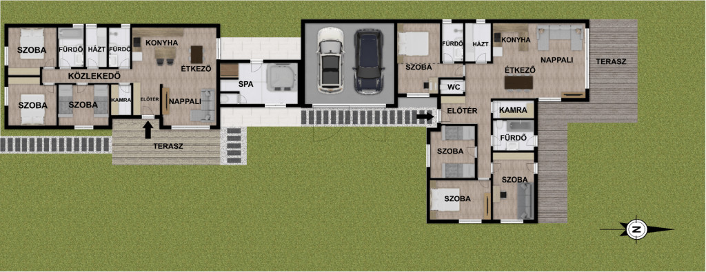 4 hálóval, 2 fürdővel, külön mosdóval, teraszokkal, 2 garázzsal rendelkező főépület.