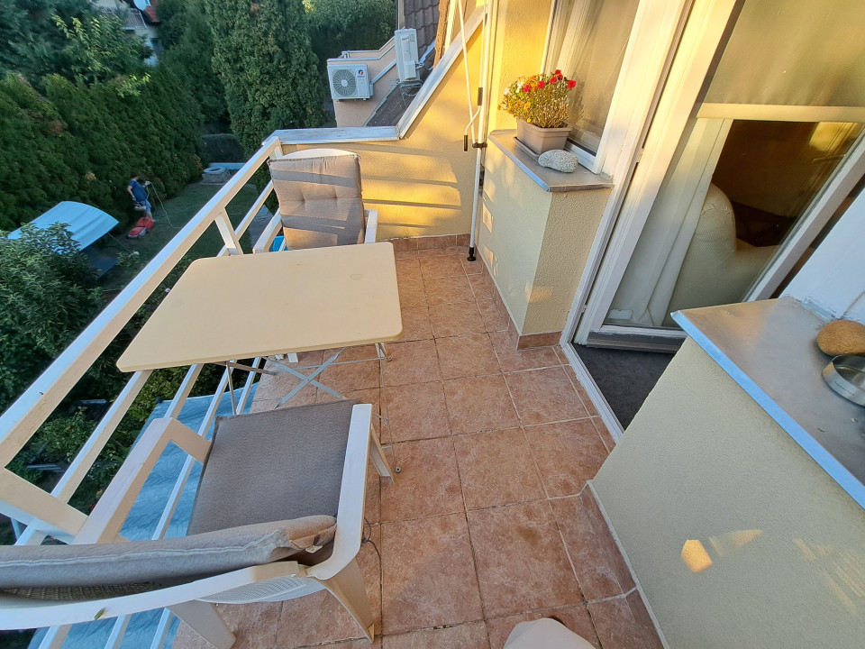 A nappalihoz utcafronti erkély, az egyik hálószobához pedig kertre néző erkély tartozik. Mindkettő kitekerhető napernyővel árnyékolható, így a nyári melegben is kellemesen használható.