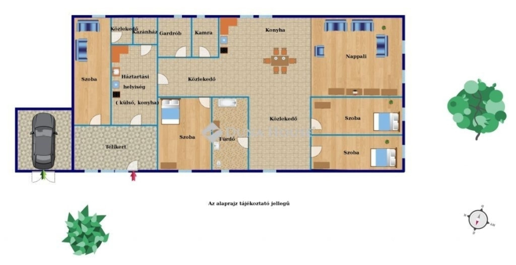 Szép, tágas amerikai konyhás nappali, 4 hálószoba, fürdőszoba, külön kialakított kamra és gardrób szoba került kialakításra.