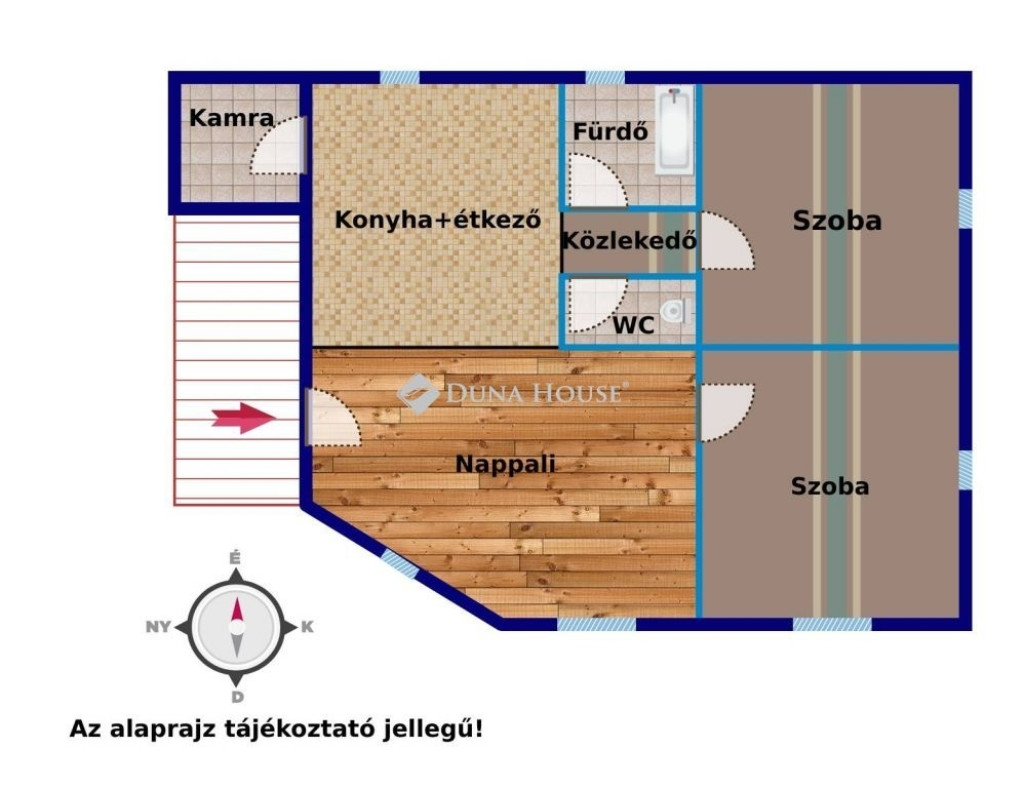 amerikai konyhás nappali, két hálószoba, fürdő, wc, kamra
