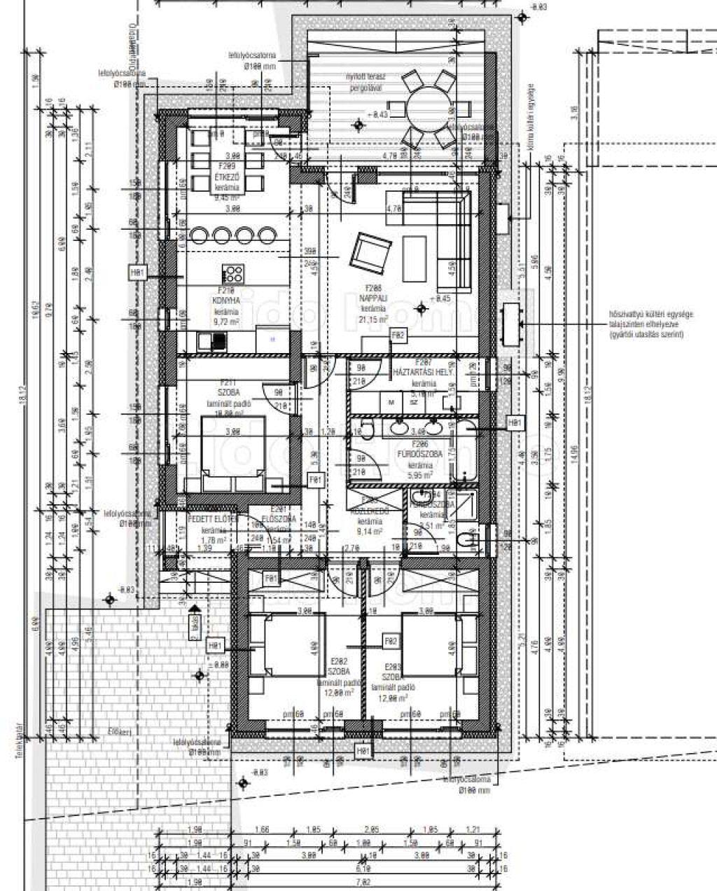 -Az ingatlan helyiségei: amerikai konyhás nappali étkezővel, 3 hálószoba, 2 fürdőszoba, háztartási helyiség, előszoba, közlekedő, fedett előtér és egy nyitott terasz pergolával.