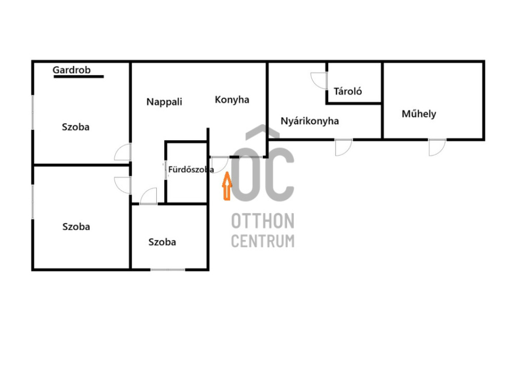 - konyha- étkező- nappali, 3 hálószoba, fürdőszoba és közlekedő elosztású