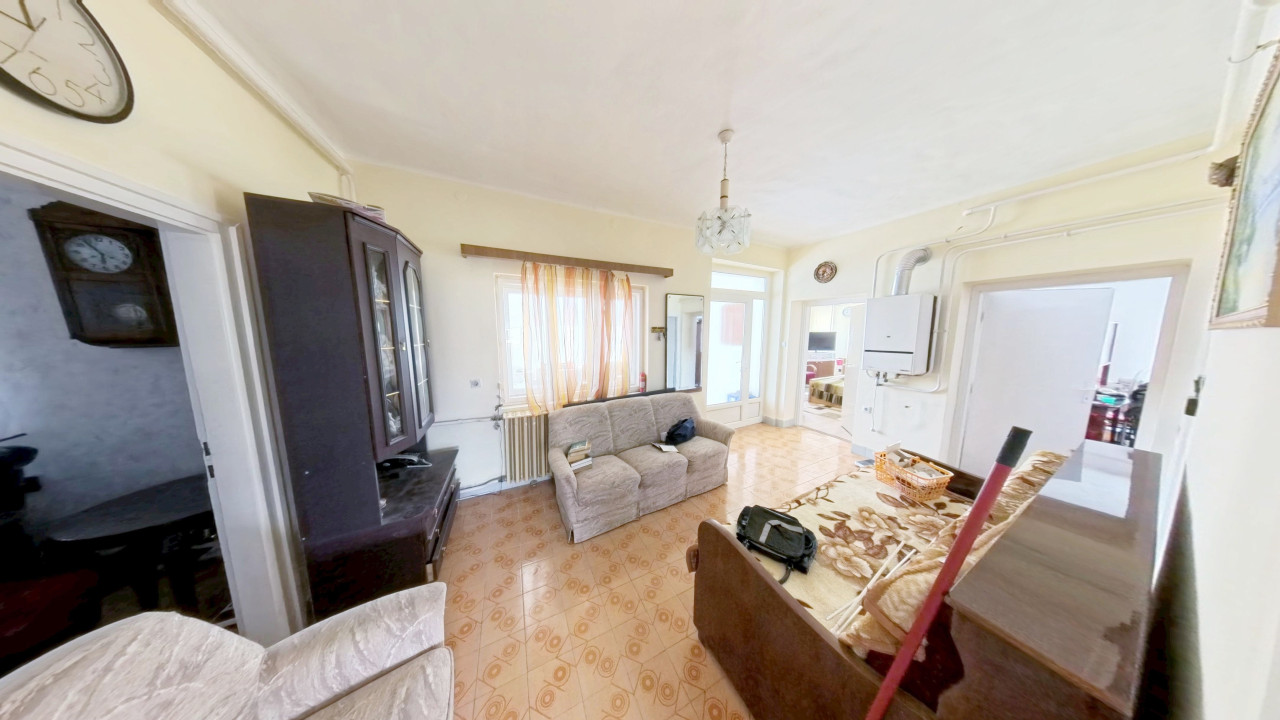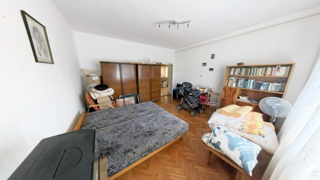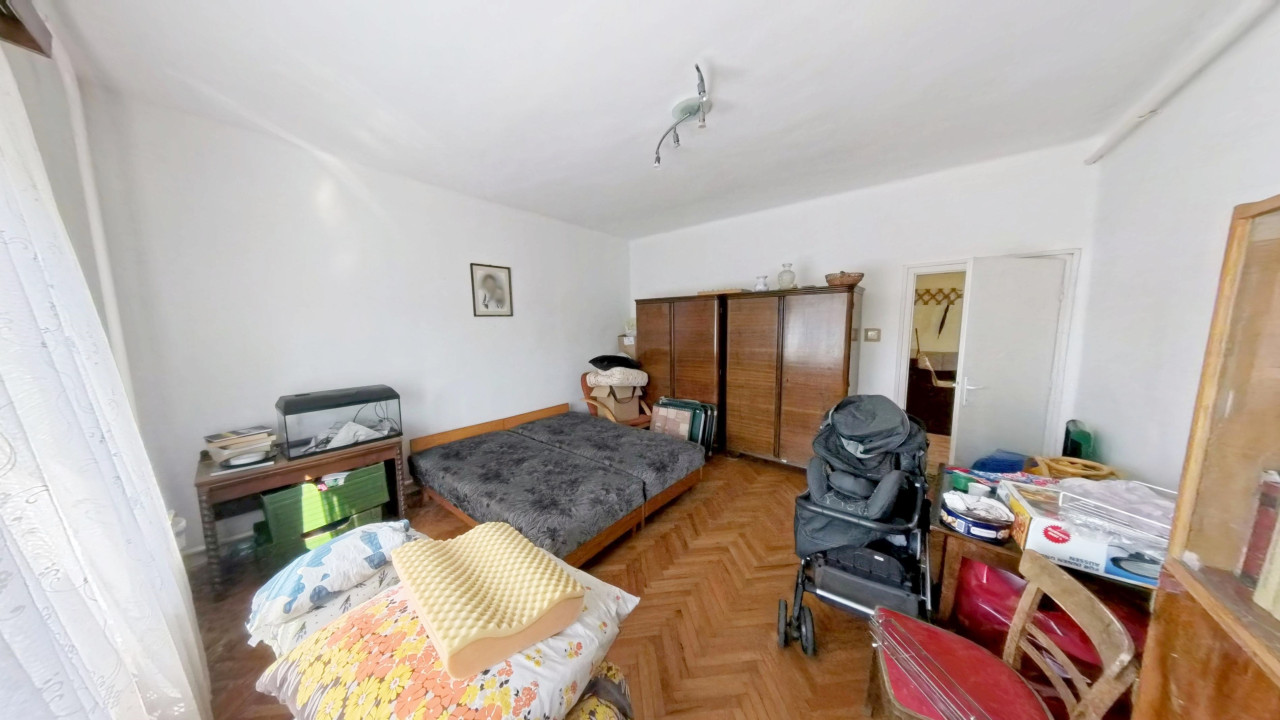 A földszinti lakórészbe belépve egy nappali élettérbe érkezünk. Innen balra az egyik IGAZÁN NAGY, laminált lappal burkolt SZOBA van. Mellette találjuk a másik szintén valóban tágas, parkettás szobát. A szoba mellett a fürdőszoba van WC-vel. A bejárattól jobbra a harmadik, parketta borítású, tényleg tágas, világos, jól bútorozható szoba található. A szoba mellett egy dolgozó szoba kapott helyet, melyből egy MÉRETES TÁROLÓ-KAMRÁN keresztül a nagy konyhába érkezünk. A konyhából közvetlenül léphetünk ki az udvarra. Így a háznak három külön bejárata van: kettő a lépcsőházba vezet, egy pedig a konyhába.