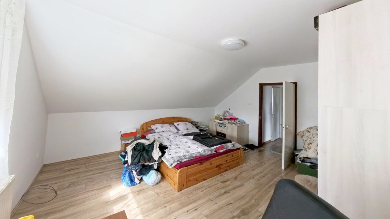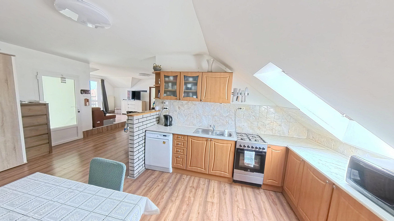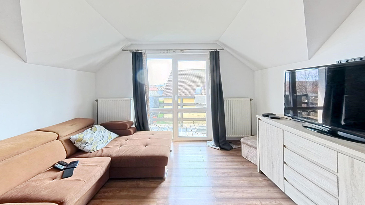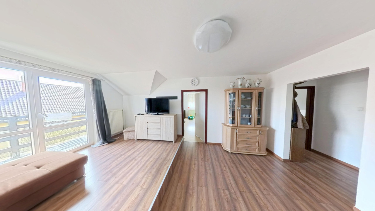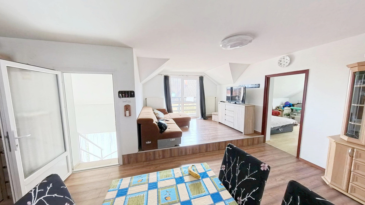 A felső lakórészbe érkezve egy TÉNYLEG HATALMAS MÉRETŰ VILÁGOS nappali-étkező-konyha térbe találjuk magunkat. Balra egy nappali rész van, melyből közvetlenül léphetünk ki a méretes erkélyre, ahonnan kitekintve IGAZÁN POMPÁS PANORÁMÁBAN GYÖNYÖRKÖDHETÜNK. A nappaliból balra nyílik két nagy méretű, JÓL BERENDEZHETŐ szoba. A szobák mellett a külön WC és a külön fürdőszoba. A bejárattal szemben a NAGYOBB TÁRSASÁG SZÁMÁRA IS TÁGAS ÉTKEZŐ van. Jobbra az ÓRIÁSI KONYHA, melyet egy nagy kamra egészít ki. A konyha mellett a harmadik szoba kapott helyet.