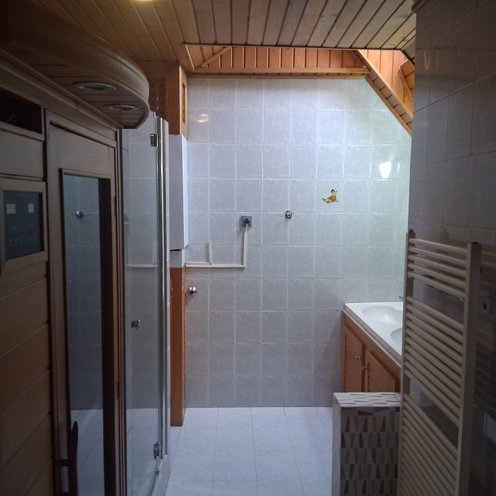 A fönti fertályban három szoba, mosókonyha, külön WC, tusolós fürdőszoba, szaunával megspékelve lett kialakítva.