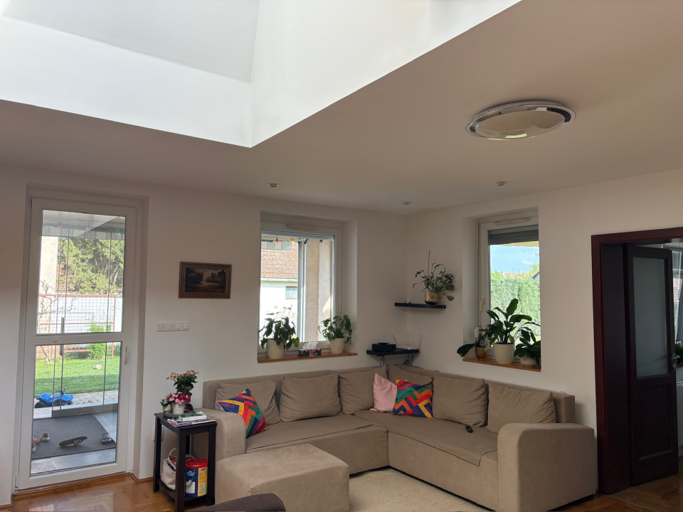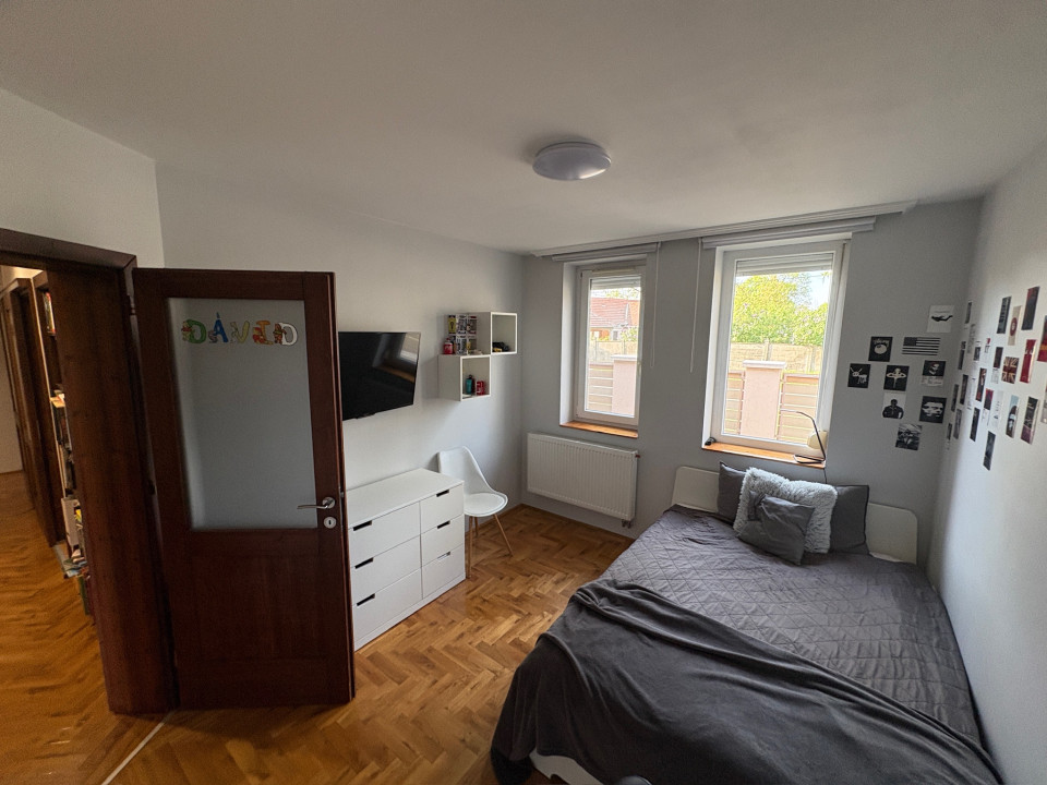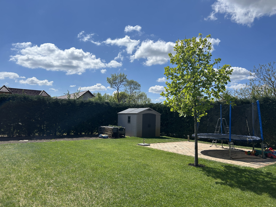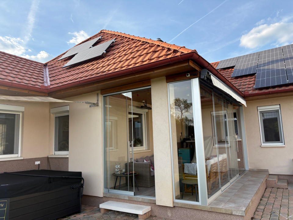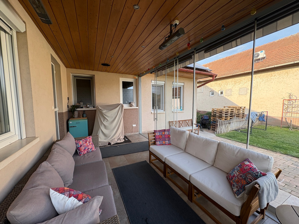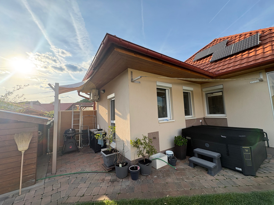 Eladó Békéscsabán a belváros közvetlen közelében (I. kerület), 2008-ban saját megrendelésre épült családi ház. A fő épület része egy nettó18 m2 területű (utcára nyíló) fűtött garázs (Hörmann kapuval), és egy szintén nettó 18 m2 alapterületű fedett terasz. A terasz előtti rész további hő elleni védelmét egy motoros árnyékoló egészíti ki. A fő falazat Porotherm Profi 44 cm vastag téglafal. 2021-ben bővítve lett egy szoba+saját fürdőszobával (Ravak zuhanyatálca és ajtó), amely gyakorlatilag nem kivehető az eredeti alaprajzhoz képest (így jelenleg 1 amerikai konyhás nappali + 4 hálószoba, 2 fürdőszoba WC-vel + 1 WC mosdóval, ÖSSZESEN NETTÓ 112 m2 lakórész) A fő fürdőszobában 2026-ban a fürdőkád előlapja, a zuhanytála (Ravak) és a zuhanykabin (Radaway), mosdócsaptelep cserélve lett. Minden csaptelep, beépített wc, zuhanypanel GROHE márkájú. A konyha teljesen felszerelt, új mosogató gép és sütő. A födém szintén 2021-ben meg lett nyitva, így 4 darab VELUX tetőtéri ablakkal természetes és egyedi megvilágítást kapott a nappali szoba, minden tetőtéri ablakhoz külső, távirányított sőtétítő roló tartozik. Minden ablakon redőny+rolós szúnyogháló. Szintén található egy cserépkályha (szigetelt Schiedel kéménybe kötve), amely közvetlenül a teraszajtó mellett található, így minimális szemeteléssel utánozhatatlan meleget varázsolhatunk a téli napokon. A terasz 2022-ben 4 évszakos, eltolható üvegfal rendszerrel lett ellátva (valamint infra hősugárzókkal), így az év 365 napjában használható. A házban 4 darab (1-3 évesek) inverteres klíma, napelem (HUAWEI tárolós rendszer) található. A fűtési rendszer radiátorokon keresztül történik, az ehhez szükséges meleg vizet és a használati meleg vizet egy szintén 2022-ben beépített Ariston kazán (külső hőmérséklet követővel) biztosítja. A kamrát, fürdőszobákat és a WC helységet leszámítva a teljes lakótérben csaphornyos fa parketta található. A padlás legnagyobb részében burkolt, járható. Az udvar parkosított, öntöző rendszer üzemel, két tároló helység található. Az udvar több helyen (összesen kb. 120 m2) térburkolattal ellátott. Az udvart teljes hosszában egy összefüggő, teljesen zárt ciprus sövény takar a maximális nyugalom érdekében (a kerítés oldalán teljesen körbejárható). Az udvar közepén egy, a tavalyi évben először virágokat hozó kaliforniai tulipánfa található. Építéskor az udvar 25 cm mélyen humusz feltöltést kapott.