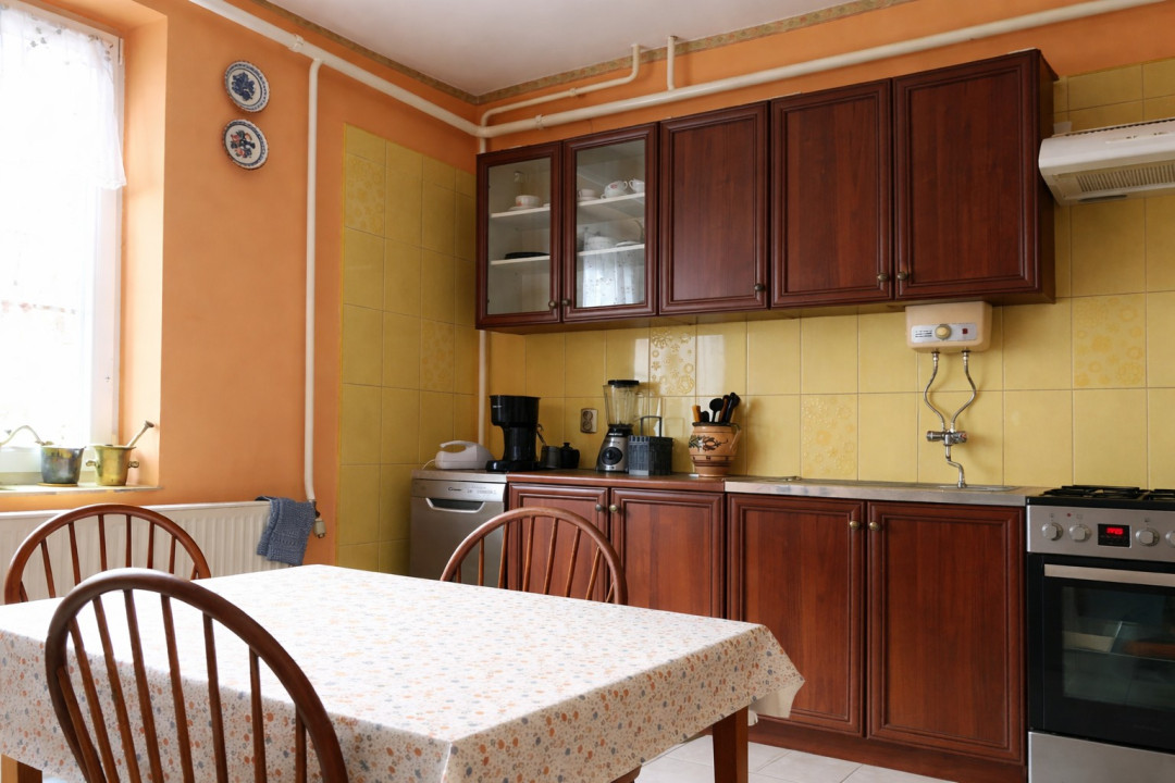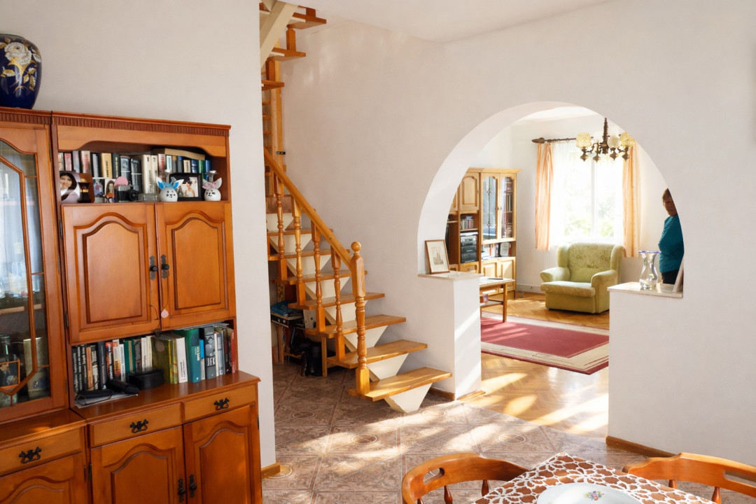A 100 m2-es földszinti rész helyiségei: előszoba, tágas világos nappali, félszoba, étkező, konyha, kamra, kádas fürdőszoba, külön WC.
