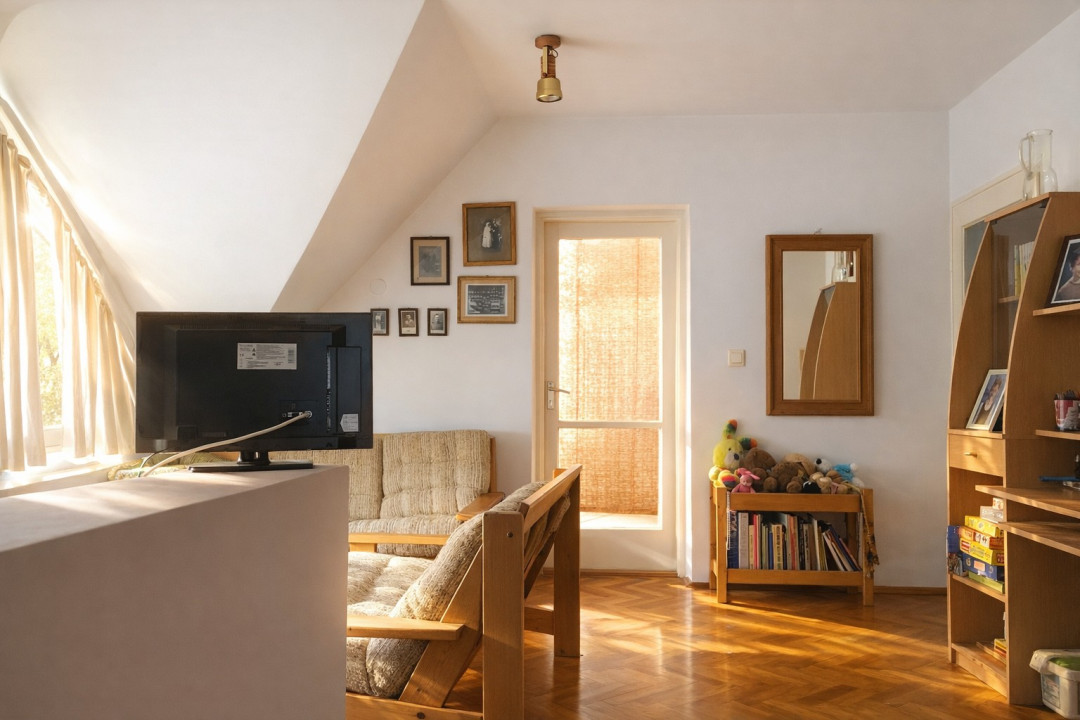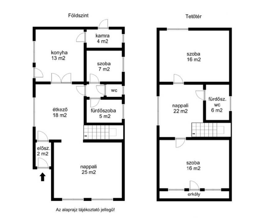 A 60 m2-es emeleti rész helyiségei: világos nappali, két szoba (az egyik erkélyes), tusolós fürdőszoba + WC.