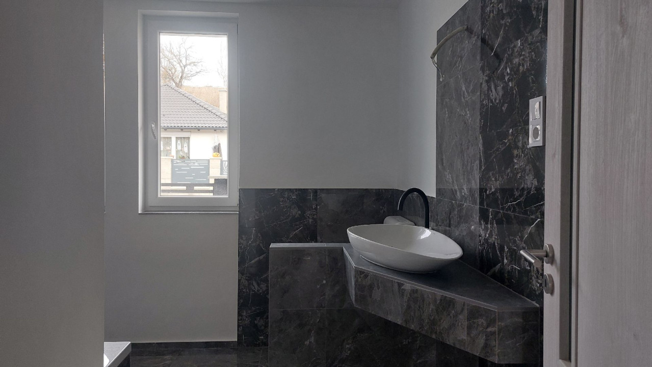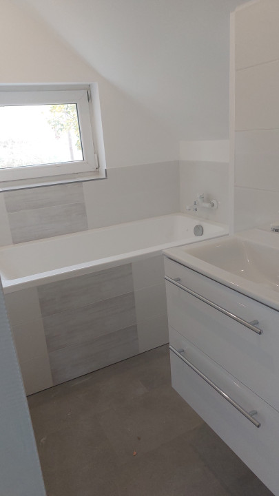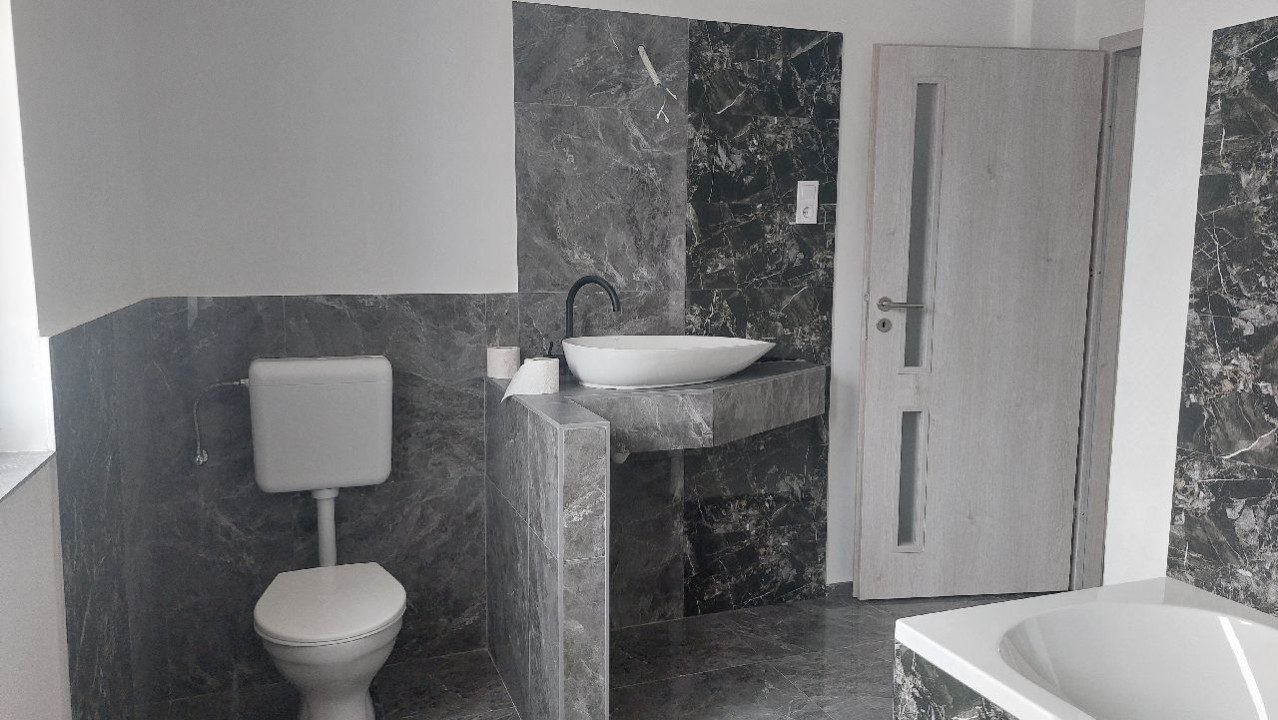 Fürdőszobákban zuhanyzó és kád is. A nagy épület alsó részén nappali +konyha, és egy teraszkapcsolatos szoba. A felső szinten két teraszra néző szoba