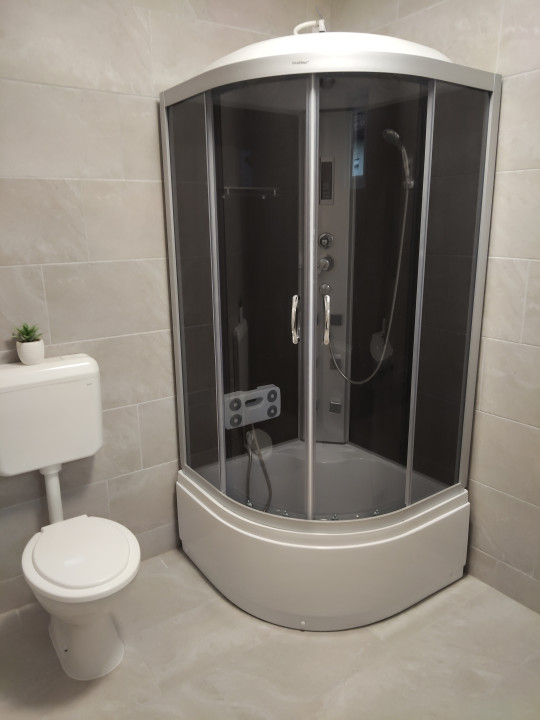 Fürdőszobában mennyezetig modern,,fiatalos szürke matt burkolat lett felhelyezett,mosdó,tükör,wc valamint egy magas sarok tálcás hidromasszázs zuhanykabin (rádió,LED fények,trópusi zuhany,lábmasszàzs funkció)