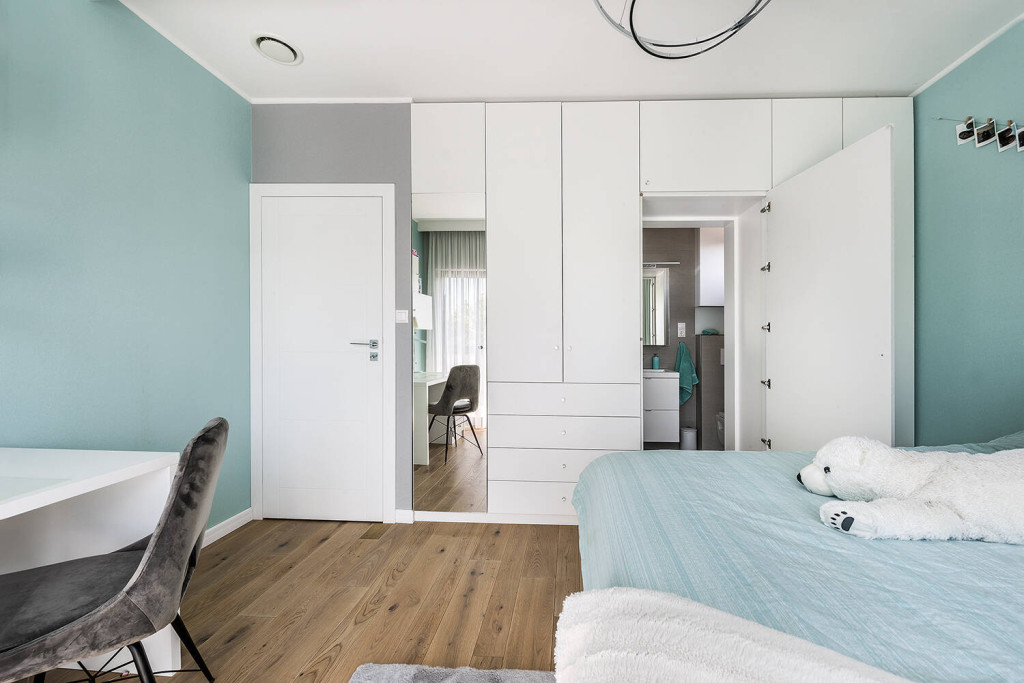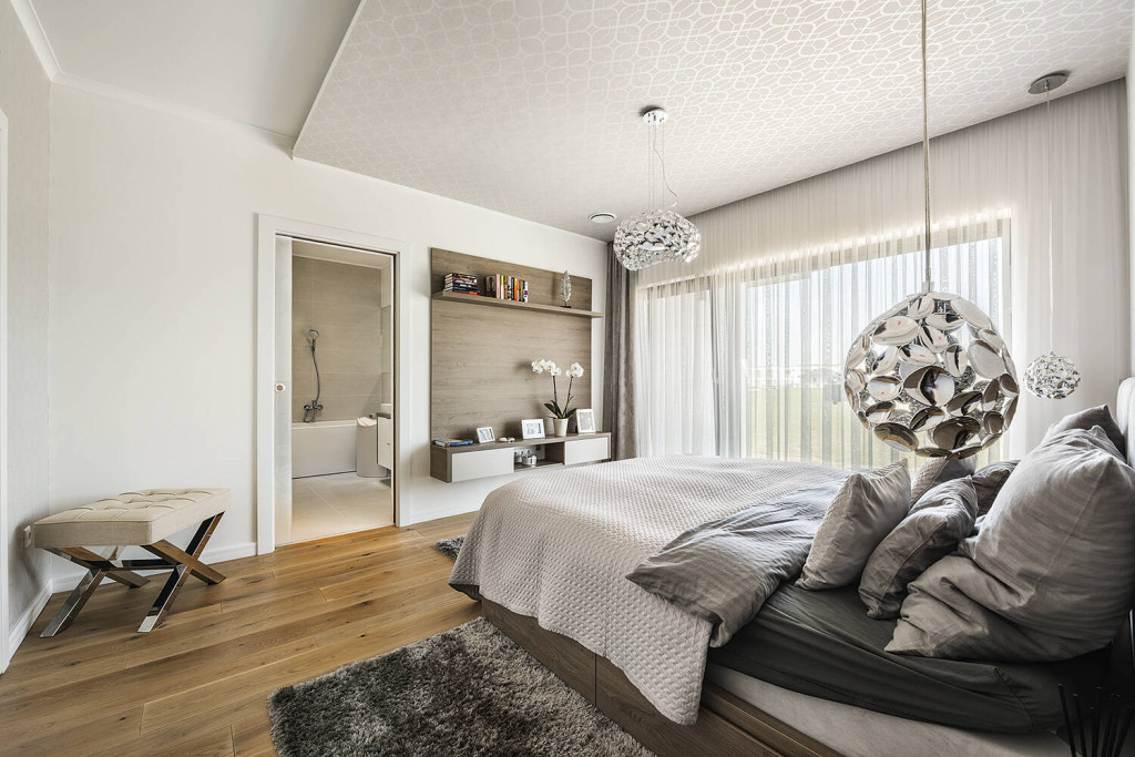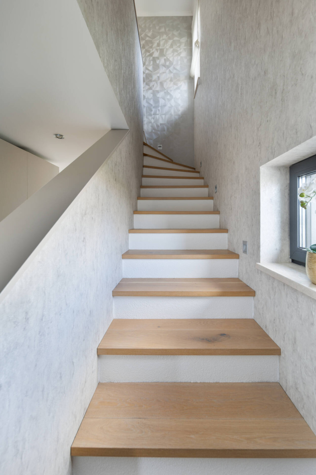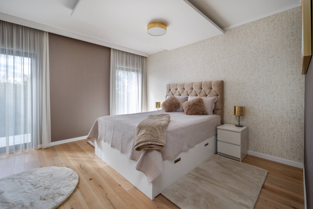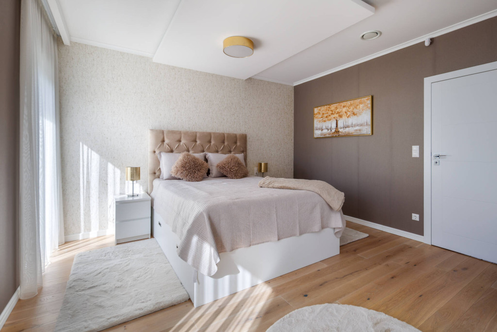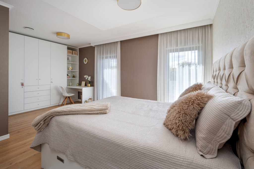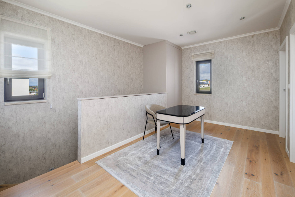 A kényelmes, stílusos lépcsőn az emeletre érkezve három különálló hálószoba várja új tulajdonosait, mindegyik saját fürdőszobával, erkéllyel, valamint külön gardrób- és háztartási helyiséggel – a mindennapi kényelem és privát szféra tökéletes egyensúlyát megteremtve.