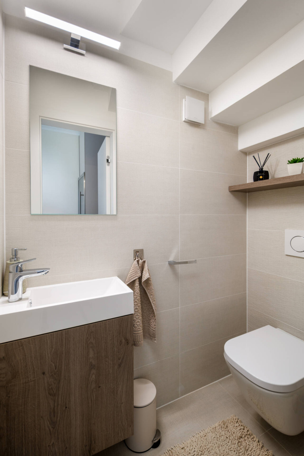 A kisebbik lakrész a földszinten egy hangulatos előszobát, amerikai konyhás nappalit és vendégmosdót kínál, míg az emeleten két kényelmes hálószoba, saját fürdő, erkély, közlekedő és mosókonyha található. Ez a rész akár vendégházként, akár önálló lakásként is funkcionálhat – ideális fiatal felnőtt családtag, nagyszülők, vagy hosszabb távú vendégek számára.