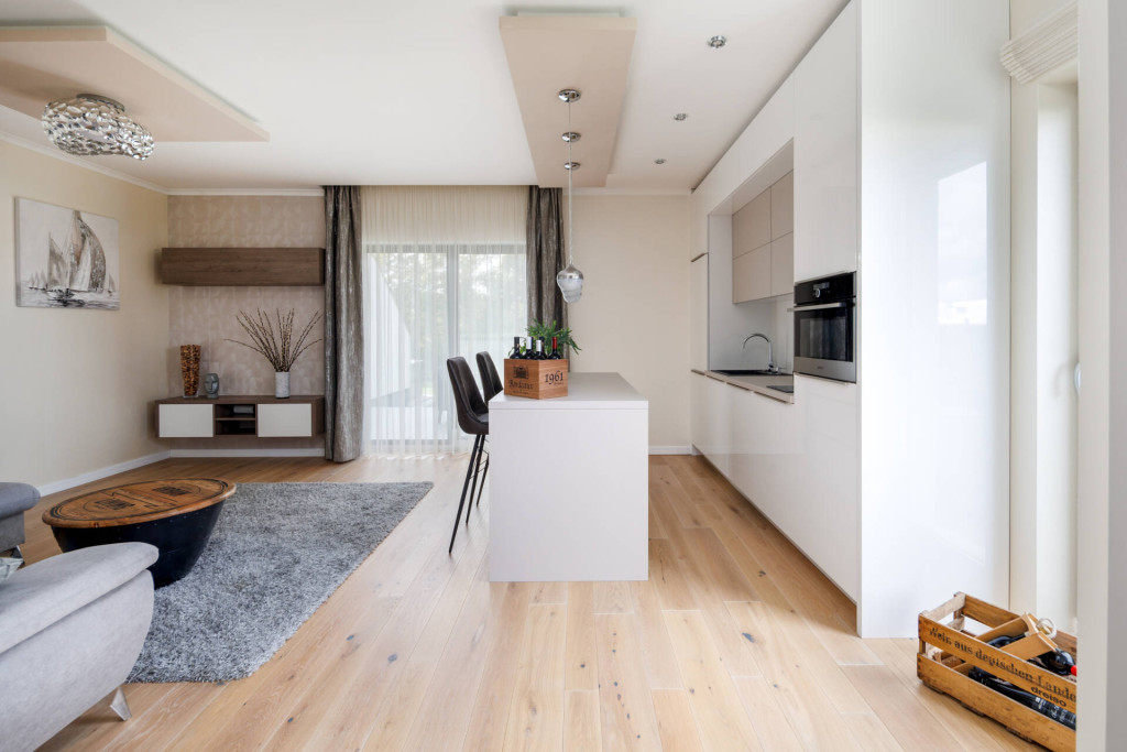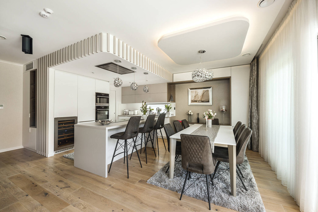 A földszinten egy impozáns, amerikai konyhás, étkezős nappali fogad, közvetlen terasz- és kertkapcsolattal. A beépített konyhabútor Gorenje csúcskategóriás gépekkel, beépített hűtővel, 2 beépített borhűtővel, mosogatógéppel, sütővel, főzőlappal, elszívóval, gőzpárolóval, mikrosütővel könnyíti meg a főzés örömét. A földszinten továbbá egy elegáns dolgozószoba, fürdőszoba, vendégmosdó és előtér került kialakításra.