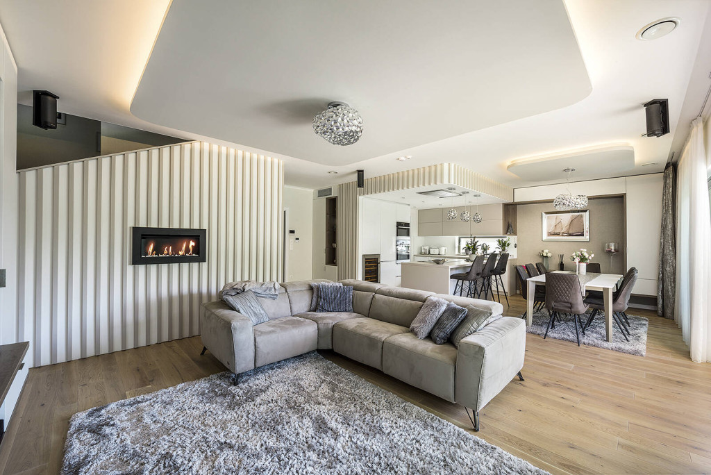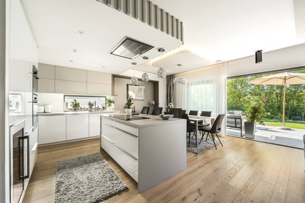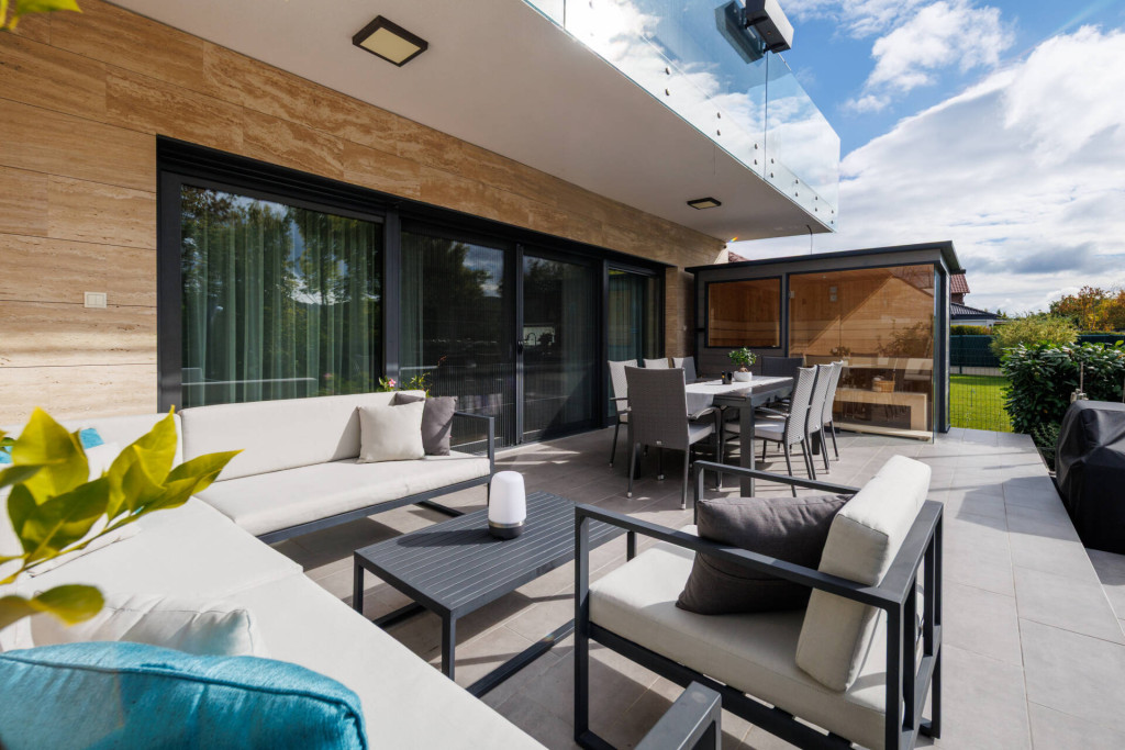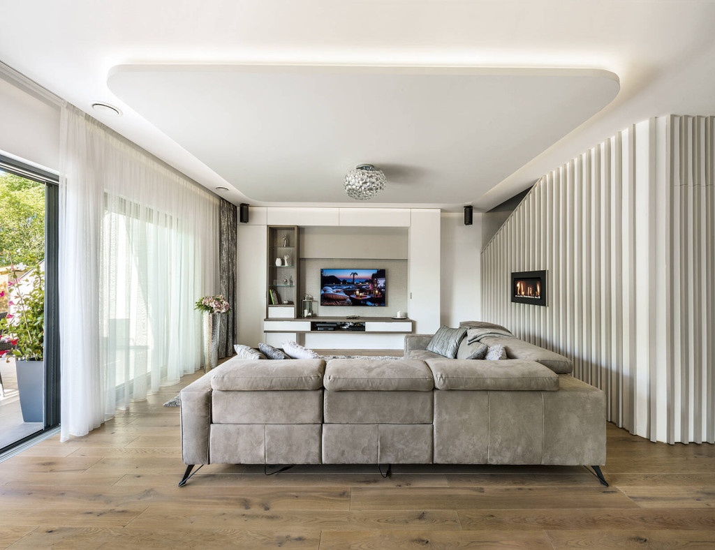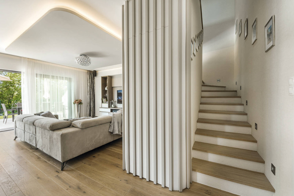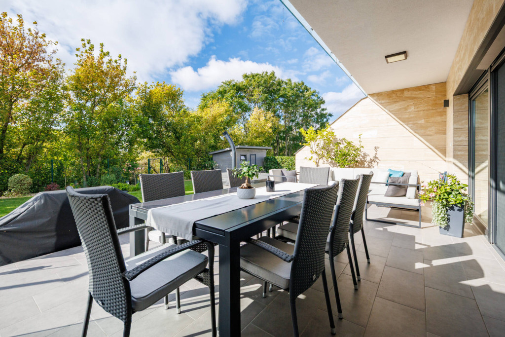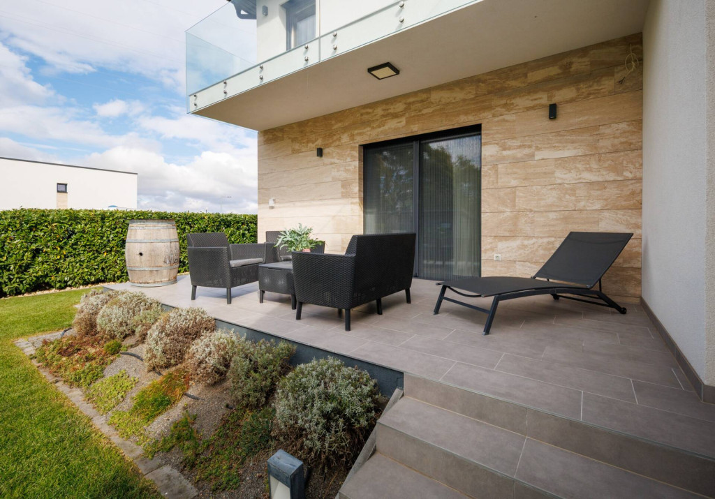 A kert tökéletességéről robotfűnyíró és öntözőrendszer gondoskodik. a modern kerti tároló a praktikumot, míg a stílusos kerti garnitúrák a pihenést és a meghitt hangulatot erősítik. A gondosan megtervezett teraszok közvetlen kapcsolatot teremtenek a nappalival és a wellnessrészleggel, így a kültér a mindennapi élet természetes kiterjesztésévé válik.
