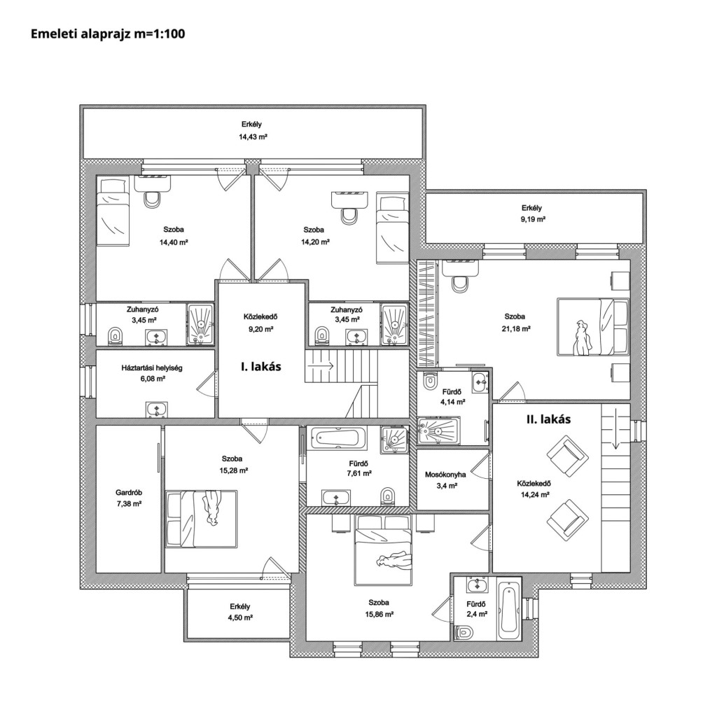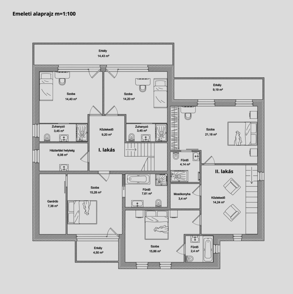 II. LAKÓEGYSÉG – (95 m² lakótér, 18 m2 terasz, 9 m2 erkély)