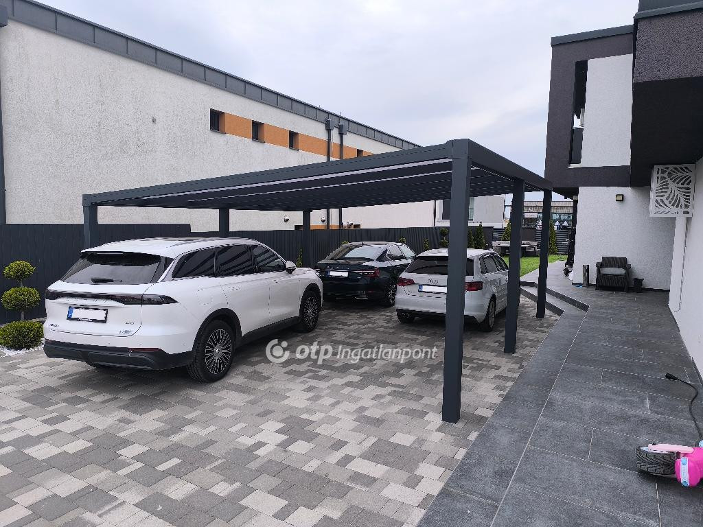 Körben masszív kerítés épült az intimitás megőrzése védelmében, a képeken látható 6m x 6m alumínium kocsibeálló polikarbonát fedéssel nemrég készült.