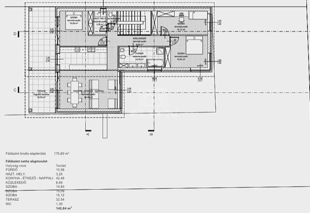 Az alsó szinten található 38 m²-es dupla garázs, valamint további helyiségek – előtér, fürdő, tárolók és gépészet – biztosítják a funkcionalitást és a rendezett életteret.