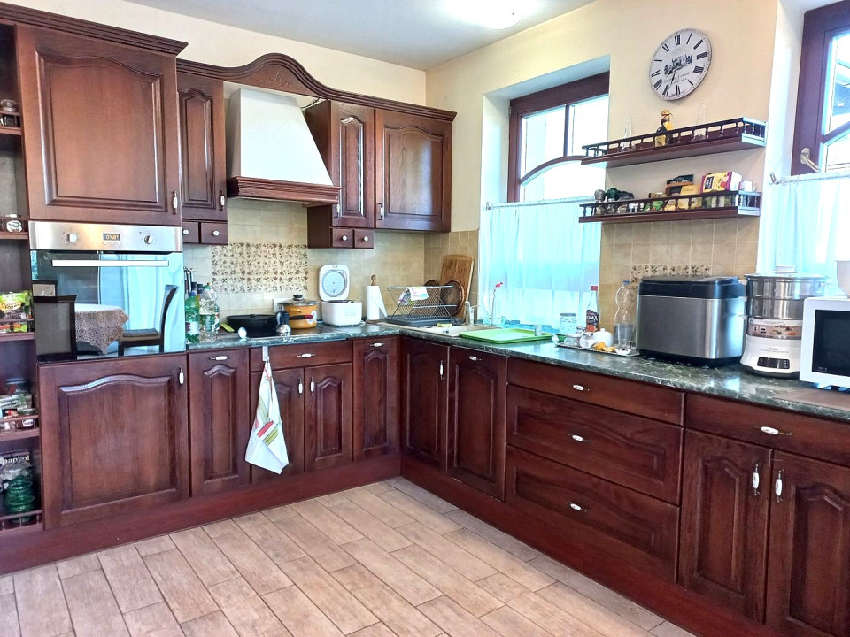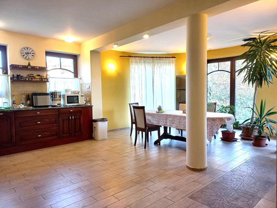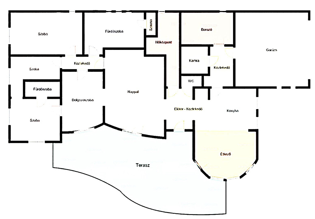 Az épületben található 3 hálószoba, 2 fürdőszoba (szaunával), egy dolgozószoba, egy központi nappali, közvetlen összeköttetéssel a 85 m2-es terasszal, konyha és étkező, valamint spájz, borozó, mosókonyha, és 2 beállásos garázs.