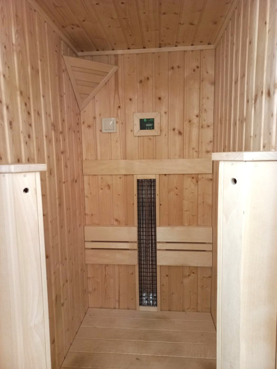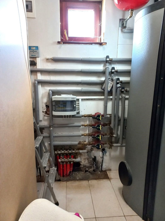 - Az épület fűtését egy Gree Versatti hőszivattyú látja el egy puffer tartályon keresztül, amelyre ráfűtenek a vákuumcsöves napkollektorok és a nappaliban található gyönyörű vízteres cserépkályha.