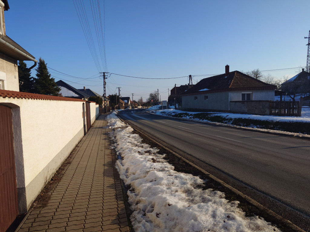 e) egy nyugodt, csendes mellékutca és a főút határolja