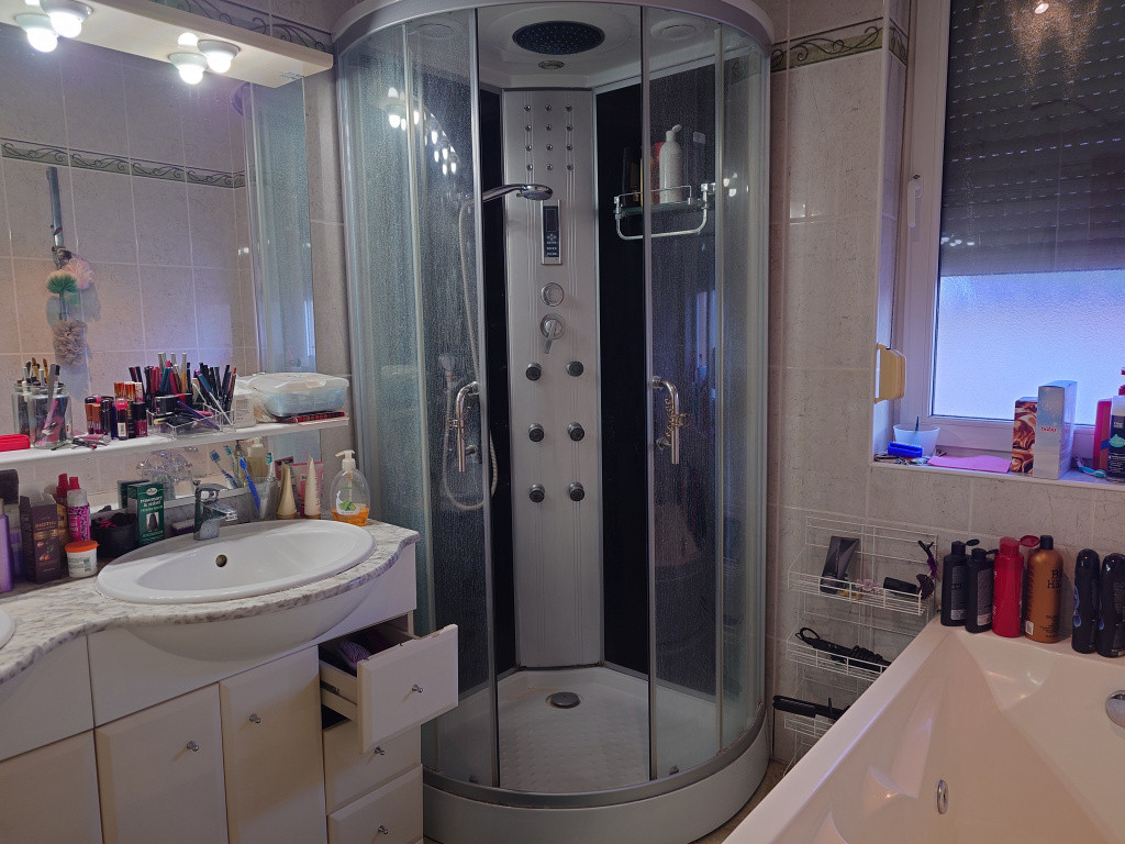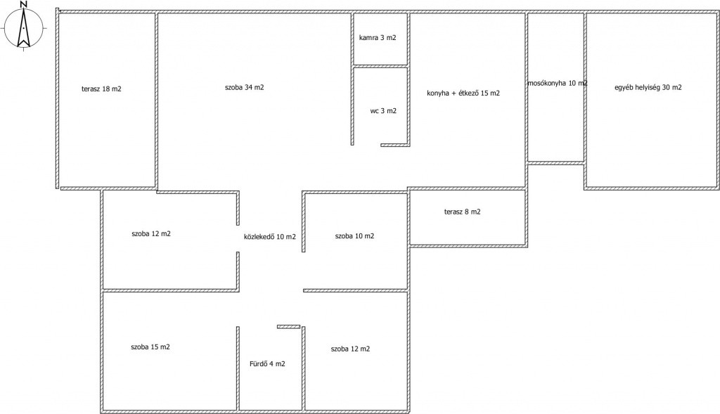 A ház föld szintje 128 m2 lakó; 26 m2 terasz + 30 m2 m2 üzleti célra is vagy lakócélra is hasznosítható mellékhelyiség kő burkolattal egybe építve a házzal, de külön bejárattal.