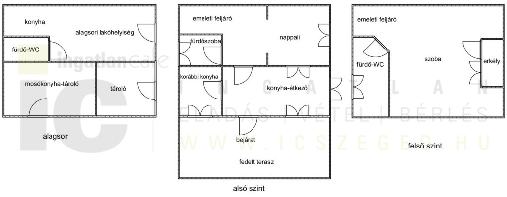 Az alsó szinten található az étkezős konyha, de rendelkezésre áll a korábban kialakított konyha is. Nappali, WC-zuhanyzó és az emeleti feljáró van még itt. A felső szinten tágas szoba, abból nyíló fedett erkély és kádas fürdőszoba lett kialakítva. Az alagsorban egy korábban lakott kis lakrész, valamint egy mosókonyha is rendelkezésre áll.