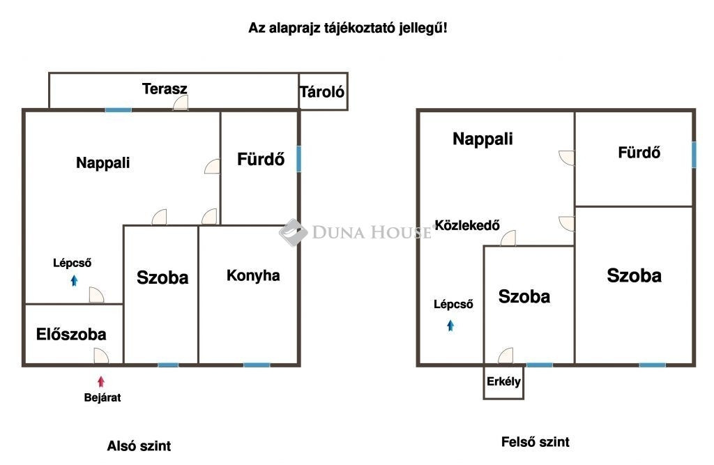 Az emeleten egy világos nappali, két hálószoba, fürdőszoba és egy praktikus tároló található ideális akár külön élettérként is.