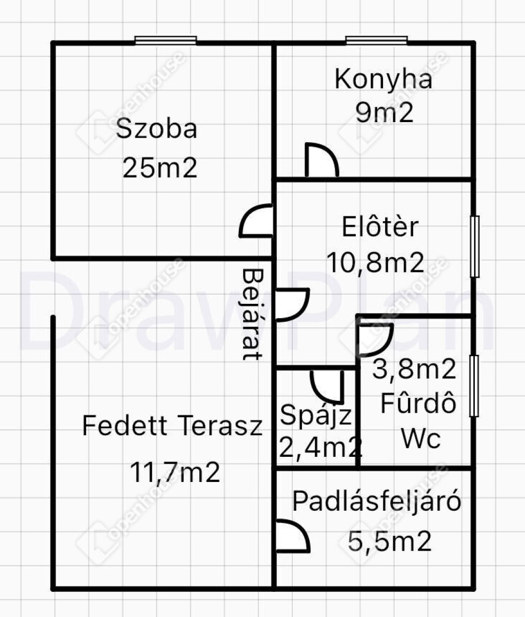 -Helyiségek 56m2 alapterületen: szoba, konyha, előtér, spájz, fürdő-wc, fedett terasz ,padlásfeljáró.