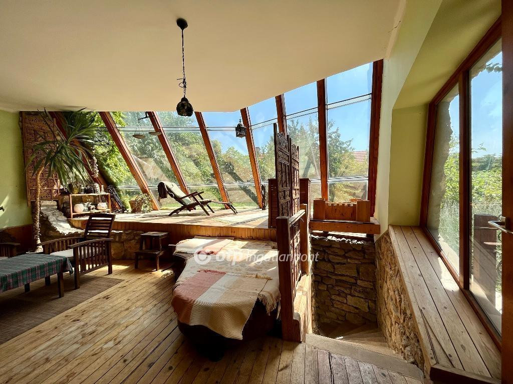 Eladó Budakalász zsákutcájában Makovecz stílusú, a hagyományos építészetet kedvelőknek, akár iskolának, magánóvódának, cég központnak is alkalmas lakóház, melynek földszinti alapterülete: 273 m2, a teljes lakóház alapterülete 500 m2 , a telek alapterülete 1054 m2. A házban 7 külön nyíló szoba, gázkazán fűtésrendszer, cserépkályha 2 helyiségben (étkezőben és a nappaliban), pinceszinten szauna és télikert található. A lakóház az organikus építészet jegyeit viseli, a Szép házak című lapban szerepelt, a kert rendezett, gyümölcsfák, és díszfák, fúrt kút találhatók benne. A házhoz garázs és két felszíni beállóhely is tartozik. Azoknak ajánlom akik szeretik a természettel összhangban álló építkezést, anyagokat, kertet és élővilágot, a tág tereket.