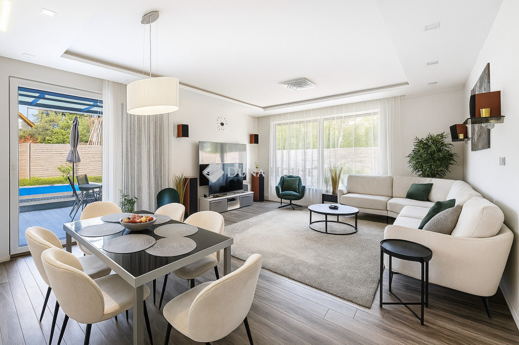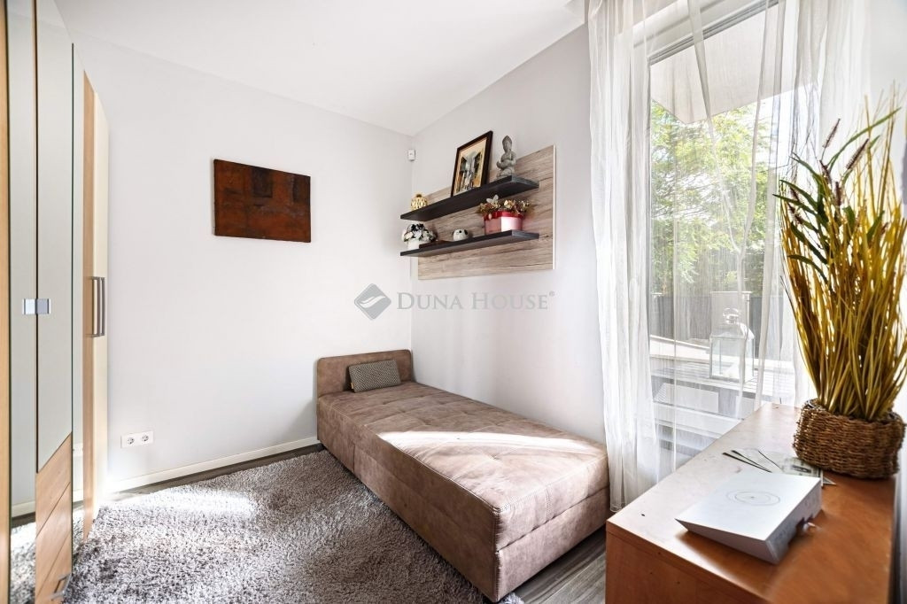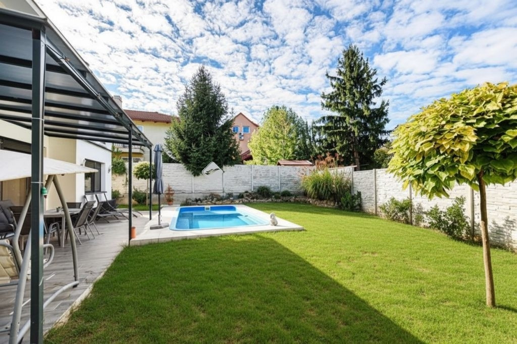 A kertkapcsolatos terasz és a medence lehetőséget kínál a pihenésre és az otthon töltött idő élvezetére, miközben a zöldövezeti környezet és a közeli kamaraerdő garantálja a friss levegőt és a természet közelségét.