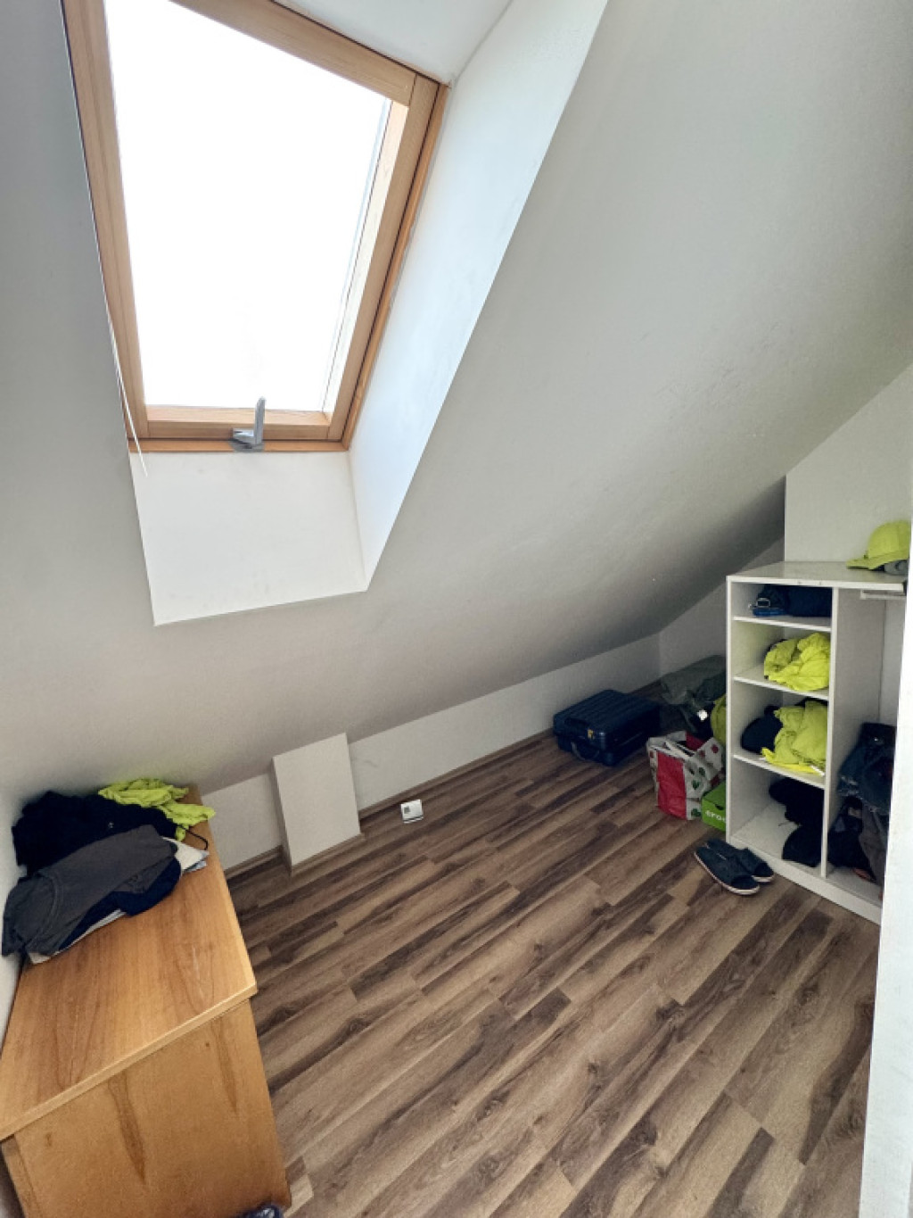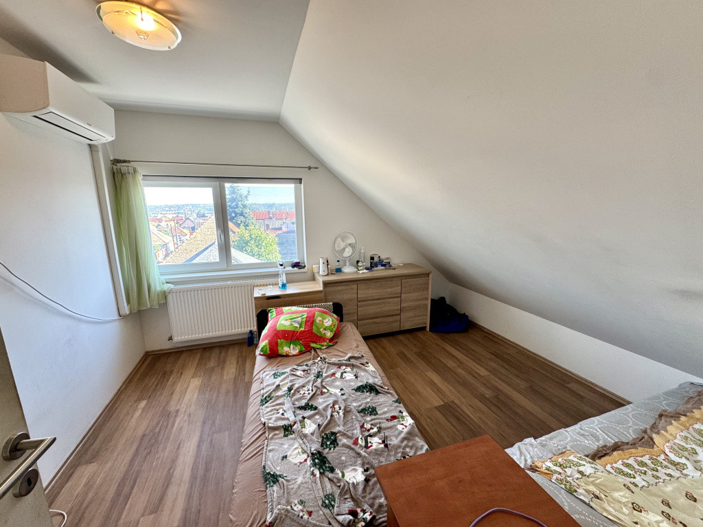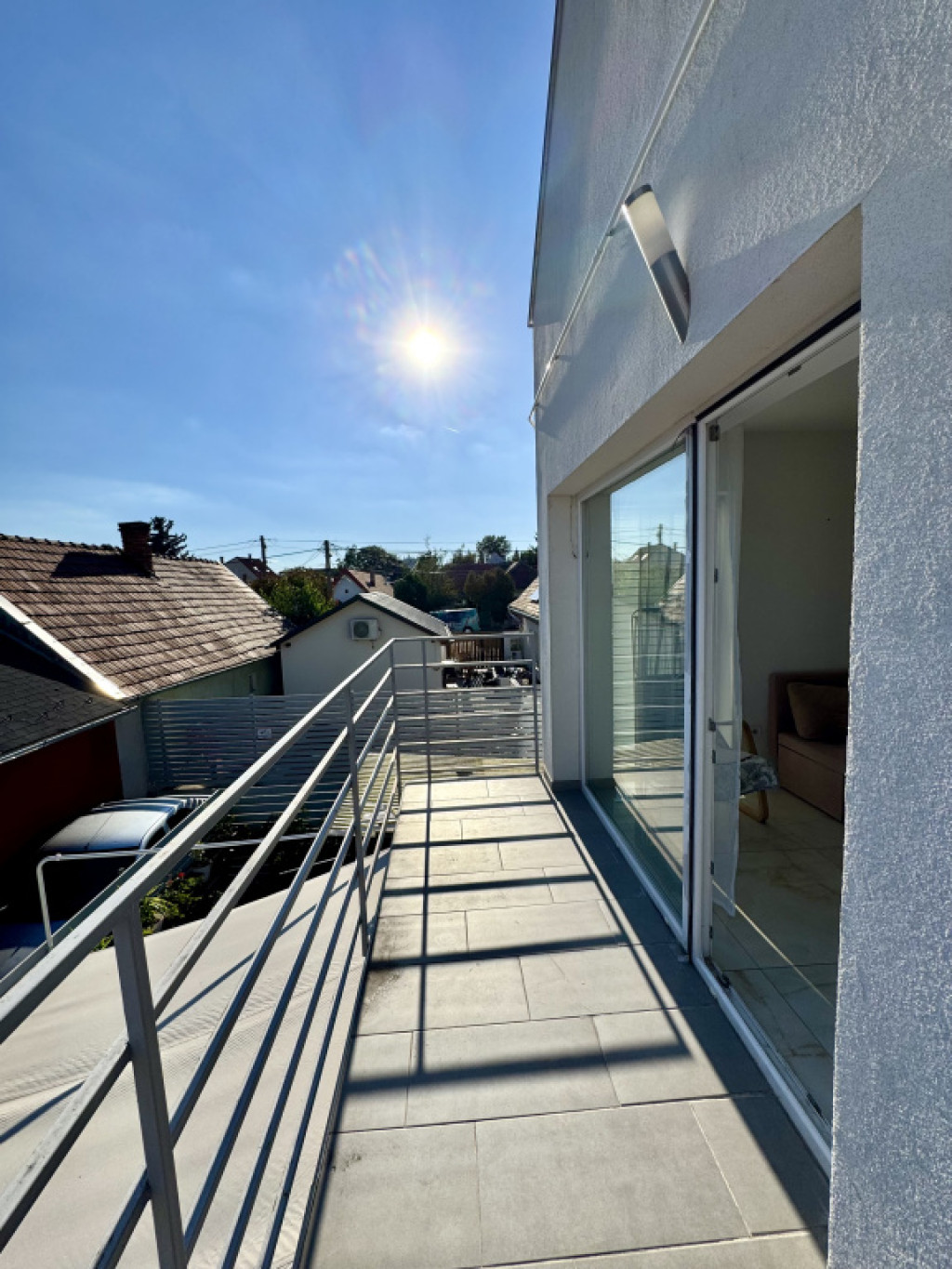 Az ingatlan mondhatni újszerű, megkímélt állapotú. Az alsó szinten található egy 30 m2-es amerikai konyhás nappali, egy 10 m2-es hálószoba és egy fürdő wc-vel (kádas), valamint egy 5,4 m2-es erkély. A tetőtérben kapott helyet 2 db hálószoba, egyik 17 m2, a másik 16 m2, illetve még egy fürdő wc-vel. Az első szinten mindenhol járólappal burkoltak, itt végig padlófűtés lett kiépítve, a tetőtérben pedig radiátorok, ott a szobákat laminált padlóval. Klimatizált mind a két emelet.