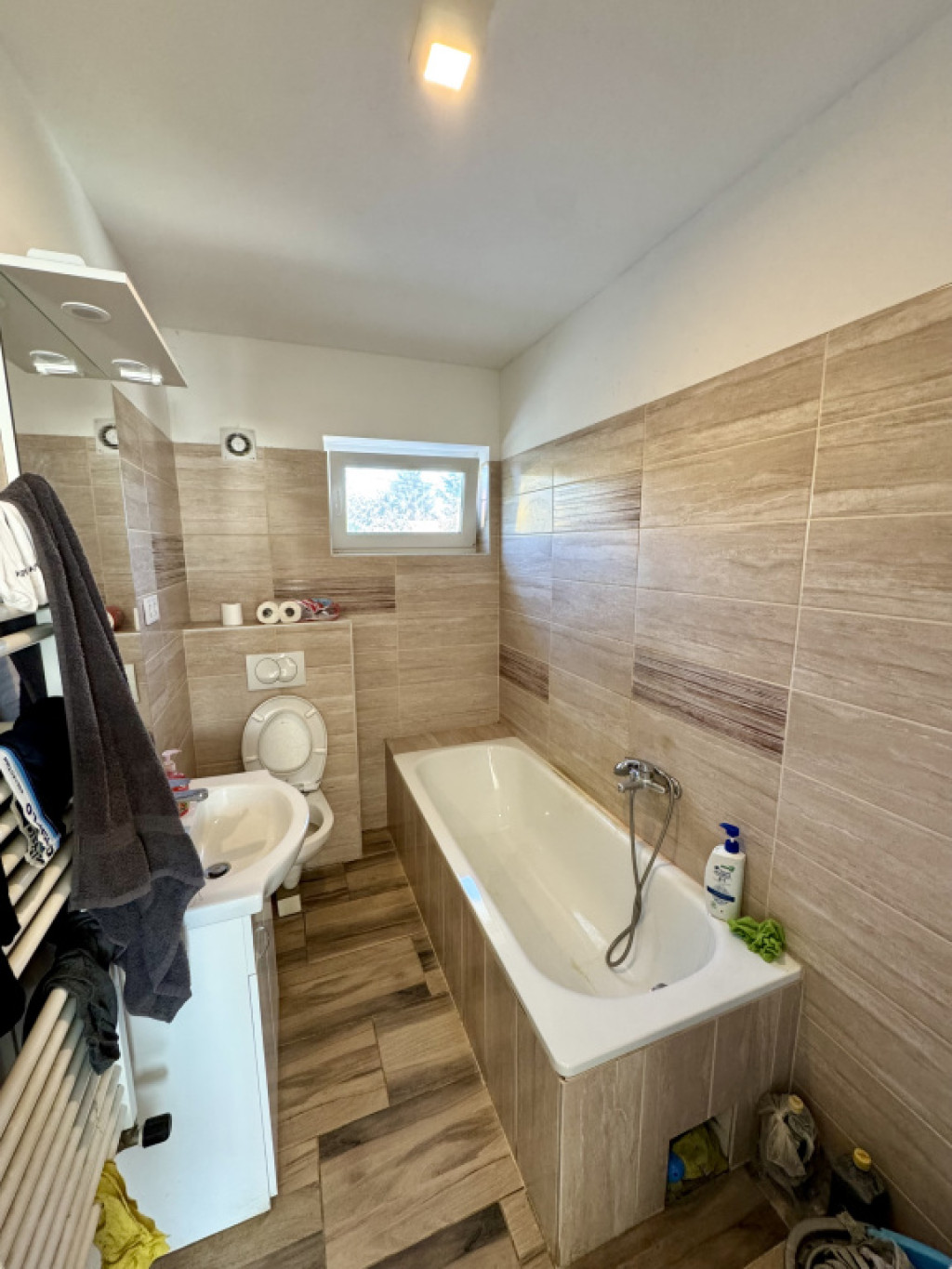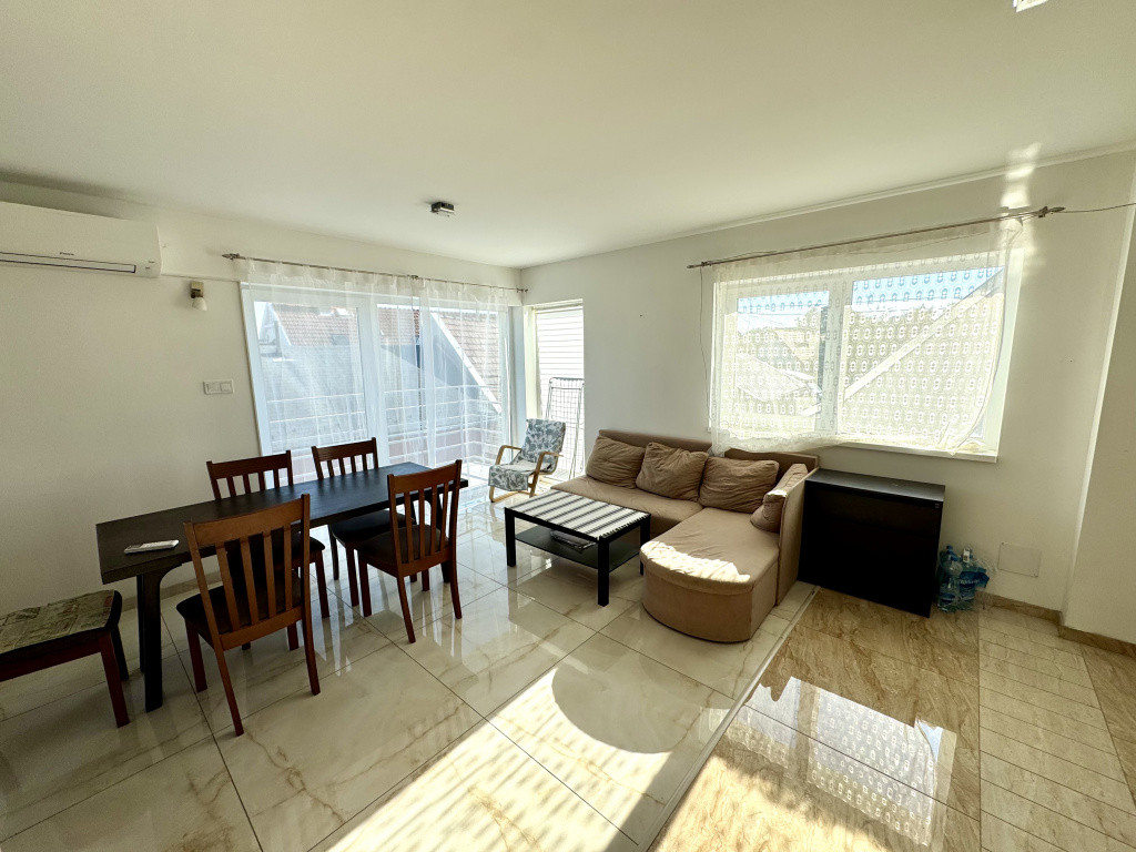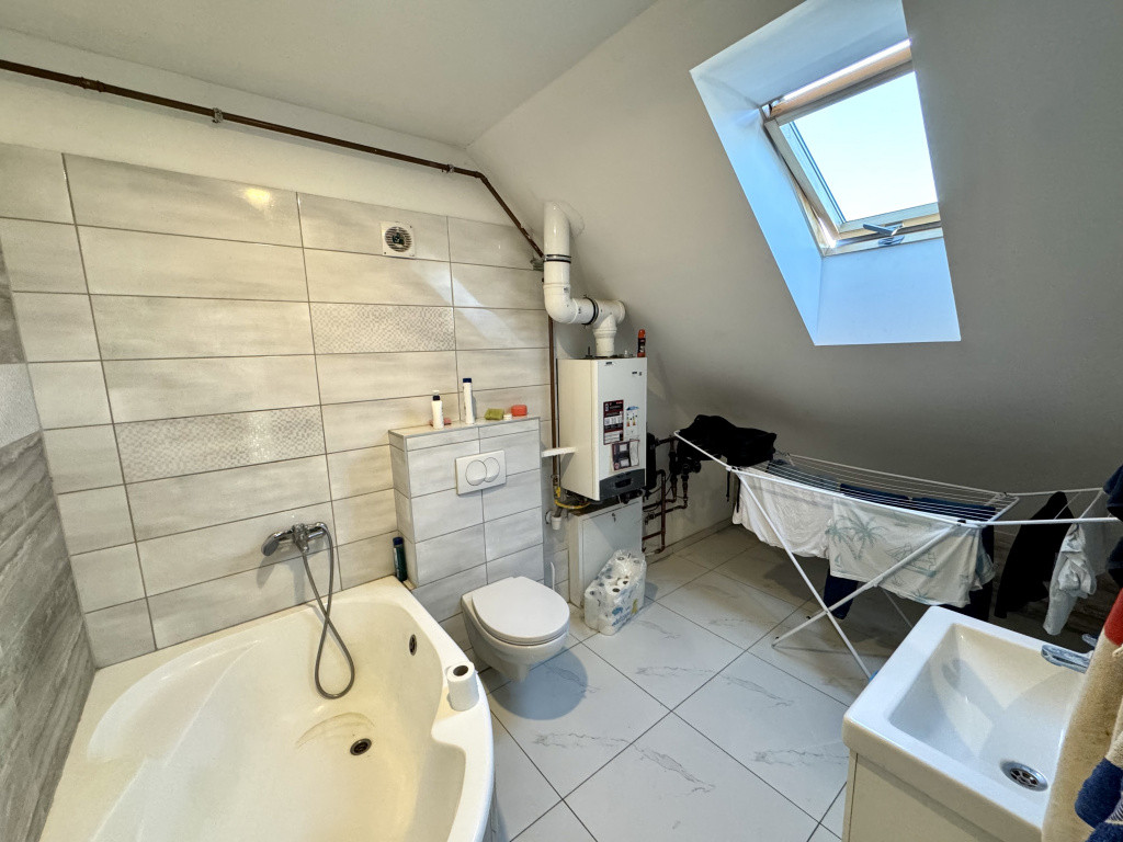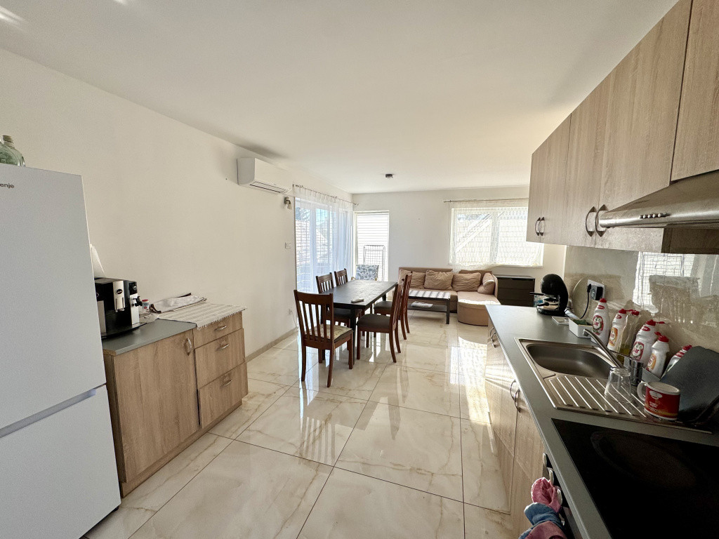 Az ingatlan mondhatni újszerű, megkímélt állapotú. Az alsó szinten található egy 30 m2-es amerikai konyhás nappali, egy 10 m2-es hálószoba és egy fürdő wc-vel (kádas), valamint egy 5,4 m2-es erkély. A tetőtérben kapott helyet 2 db hálószoba, egyik 17 m2, a másik 16 m2, illetve még egy fürdő wc-vel. Az első szinten mindenhol járólappal burkoltak, itt végig padlófűtés lett kiépítve, a tetőtérben pedig radiátorok, ott a szobákat laminált padlóval. Klimatizált mind a két emelet.